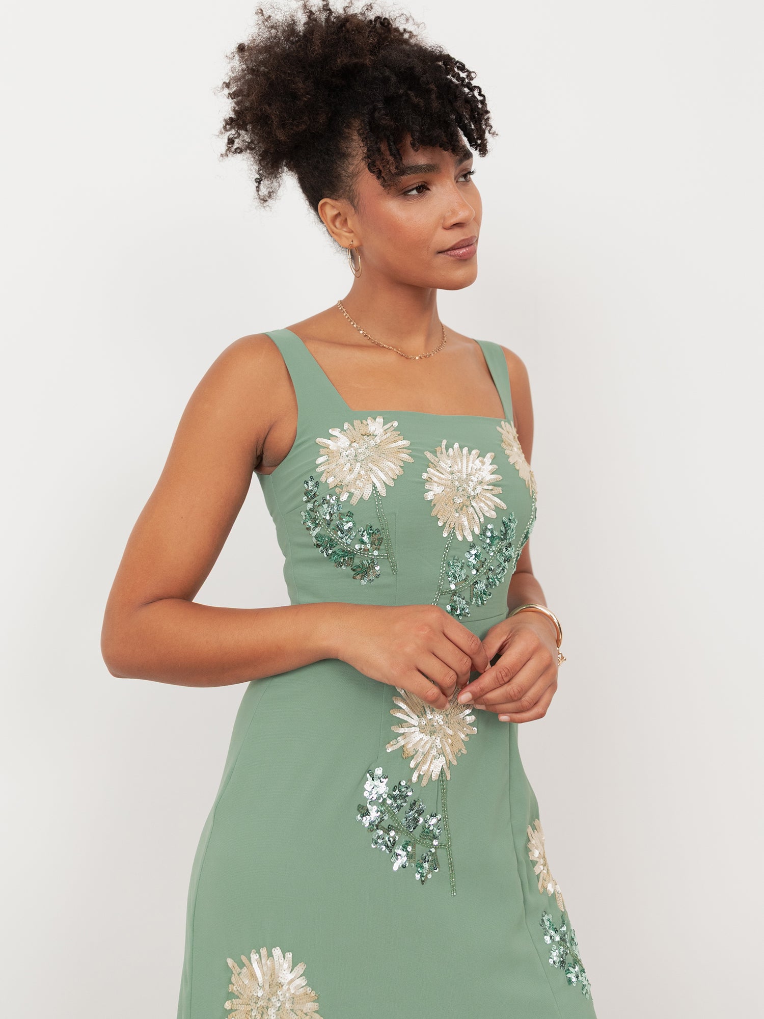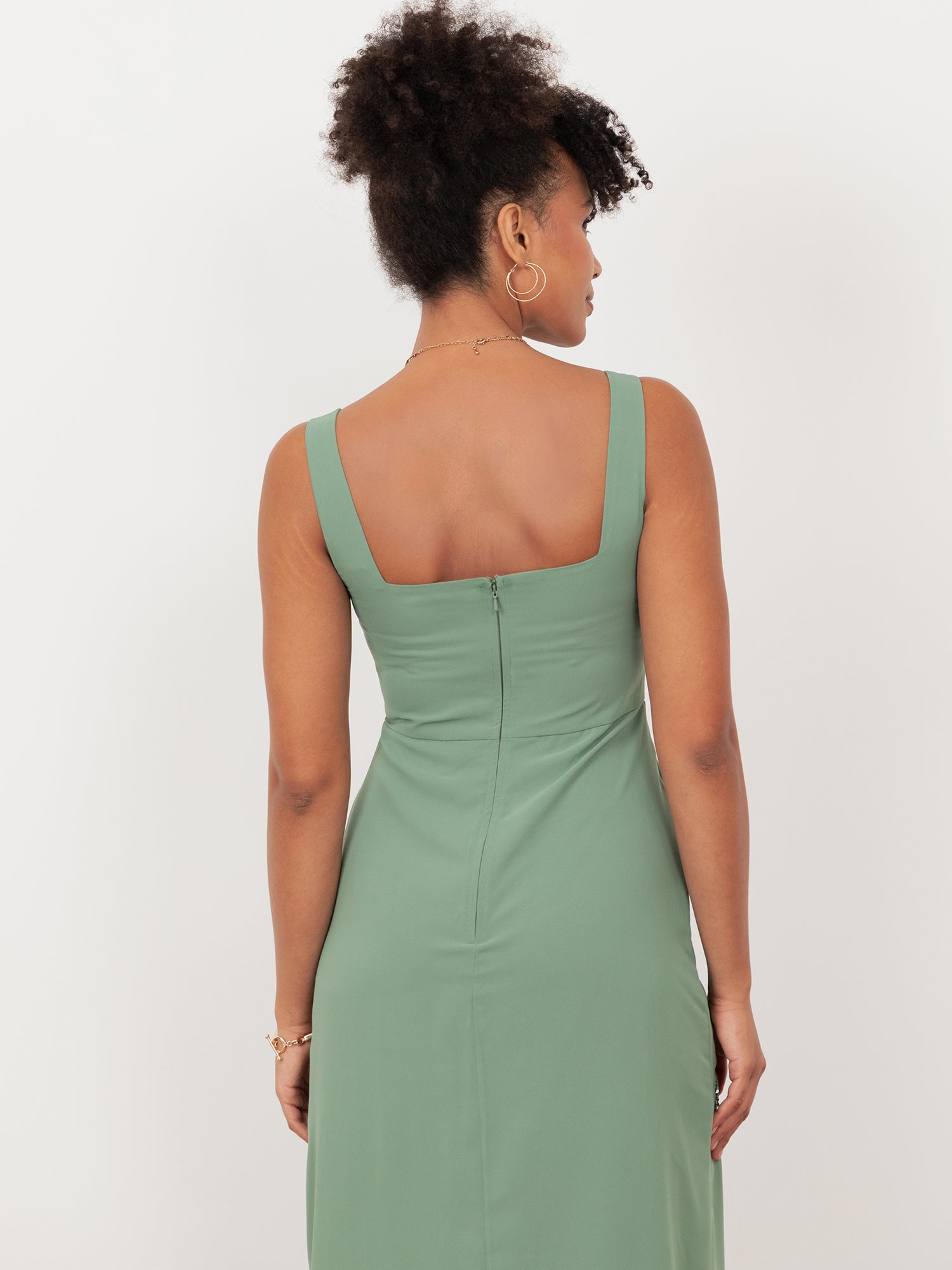 Maya Dark Sage Green Floral Embellished Square Neck Midaxi Dress with Split