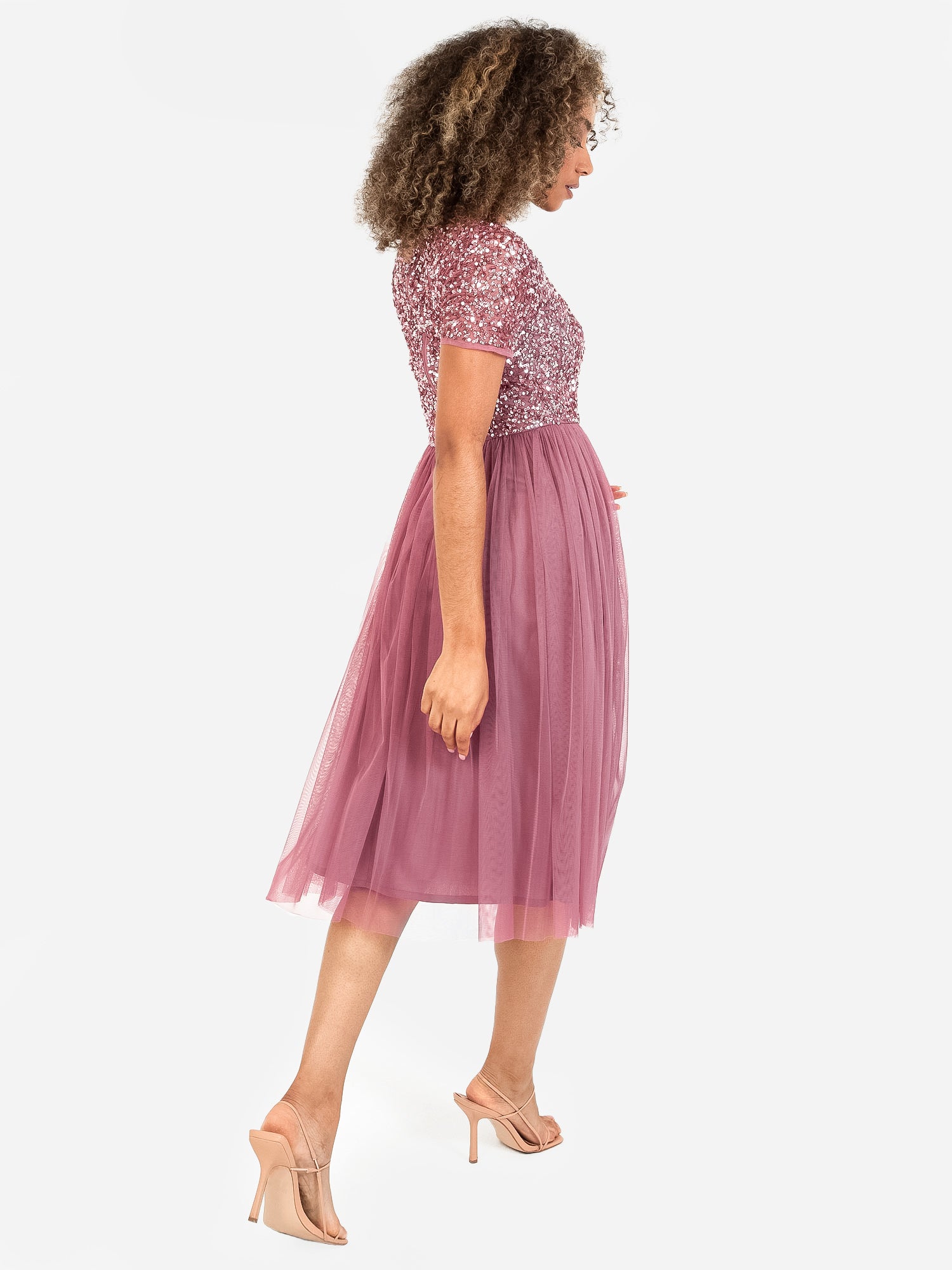 With a little twist on our most popular bridesmaids dress this midi version is a perfect choice for summer weddings and other special occasions. Maya’s adored hand sewn sequin embellishment over the fitted V neck bodice gives this dress enough sparkle to twinkle at the altar while the soft tulle skirt flowing from the cinched waist complements the figure with its A line shape.