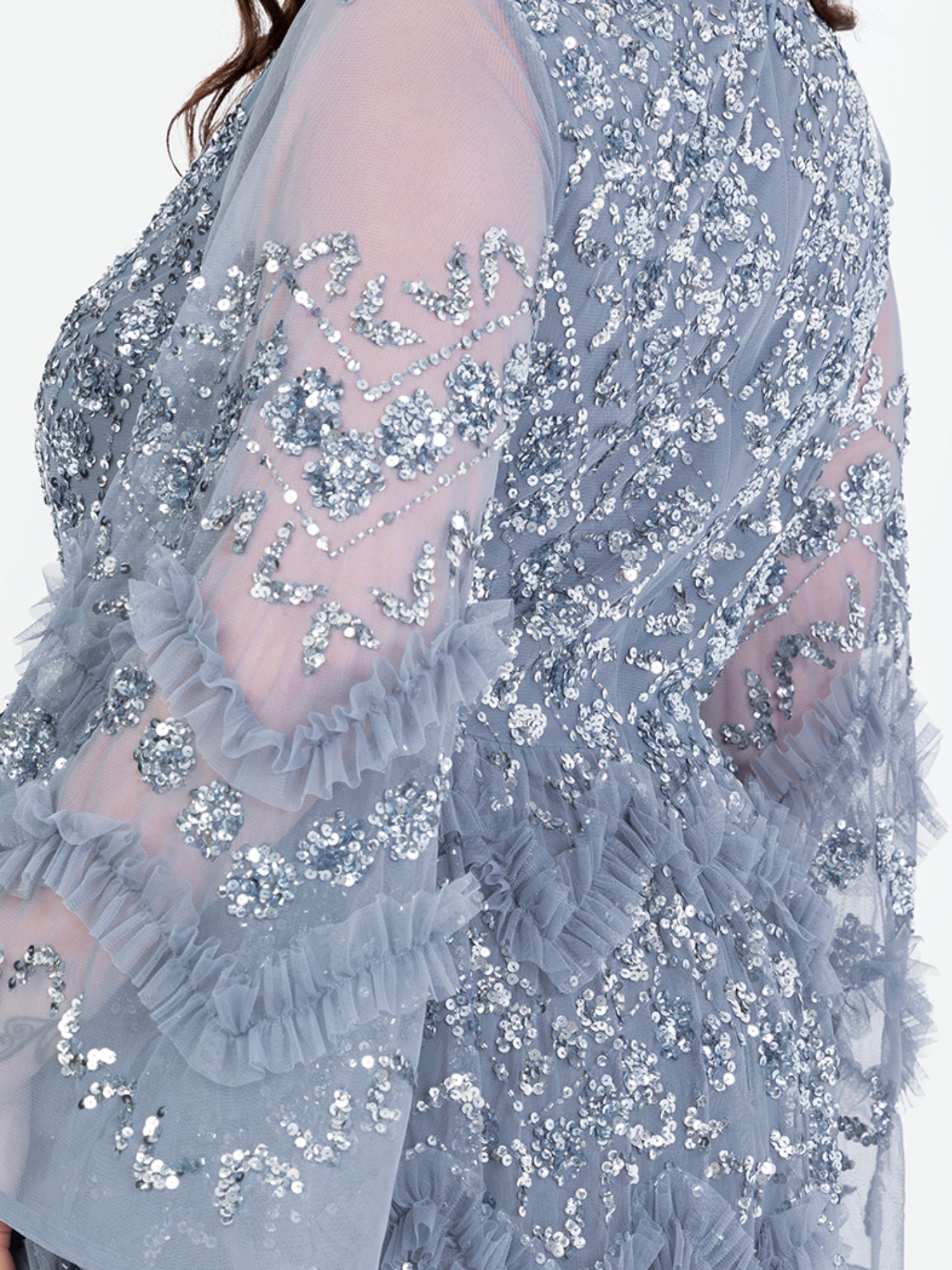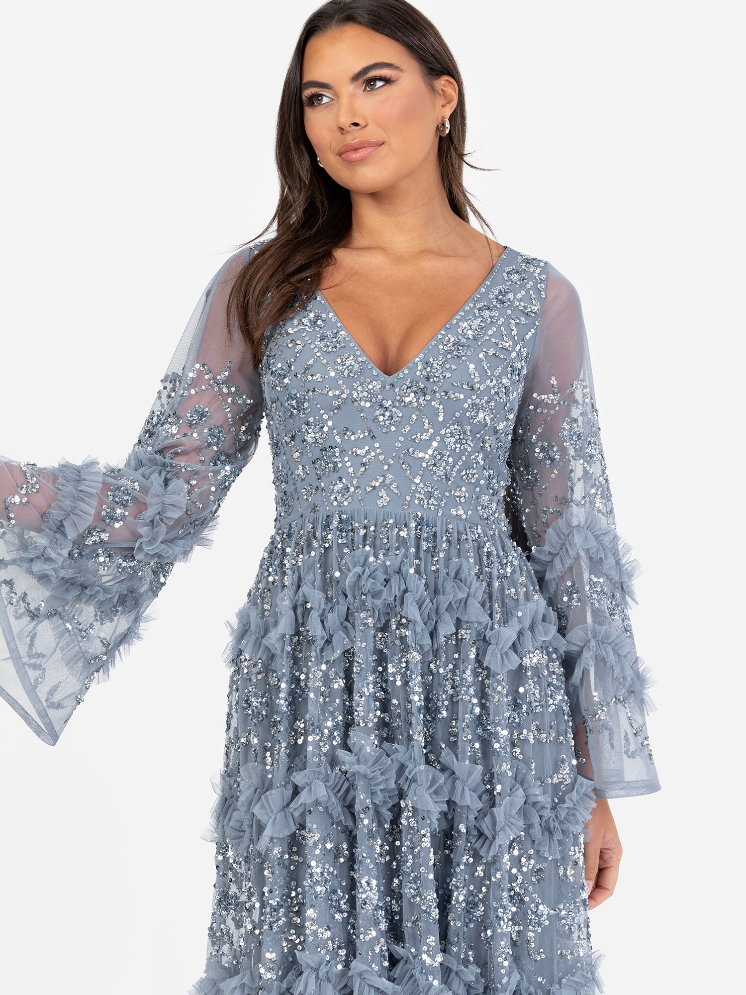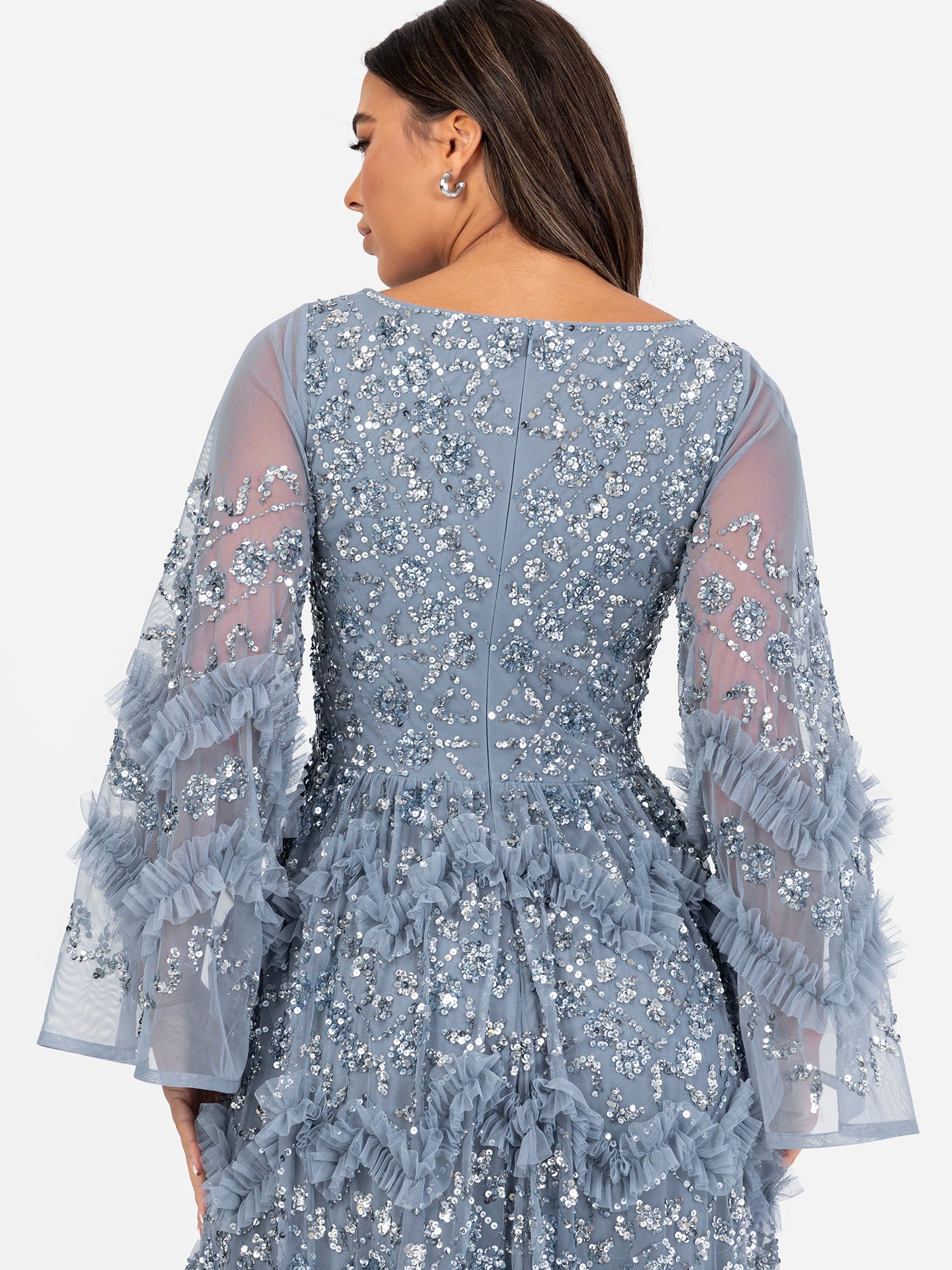 Maya Dusty Blue Fully Embellished Maxi Dress with Frill Detail