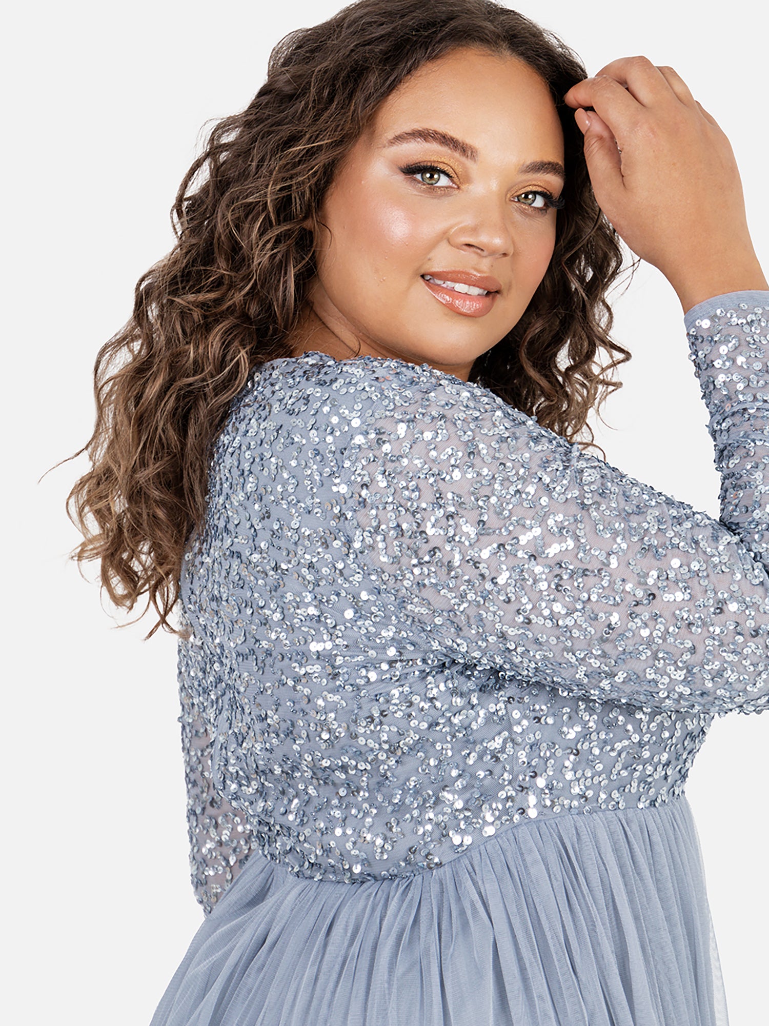 Feel elegant in this long sleeve maxi dress from Maya Deluxe perfect for autumn events. Most popular Dusty Blue shade is drenched with shimmering hand embellishment over the fitted bodice and long sleeves layered with extra tulle fabric for comfortable wear. Featuring a classic V neckline and a floor sweeping soft tulle skirt that flairs from the waist giving the dress a romantic finish. This is an updated design of our most popular style perfect for bridesmaids and proms.