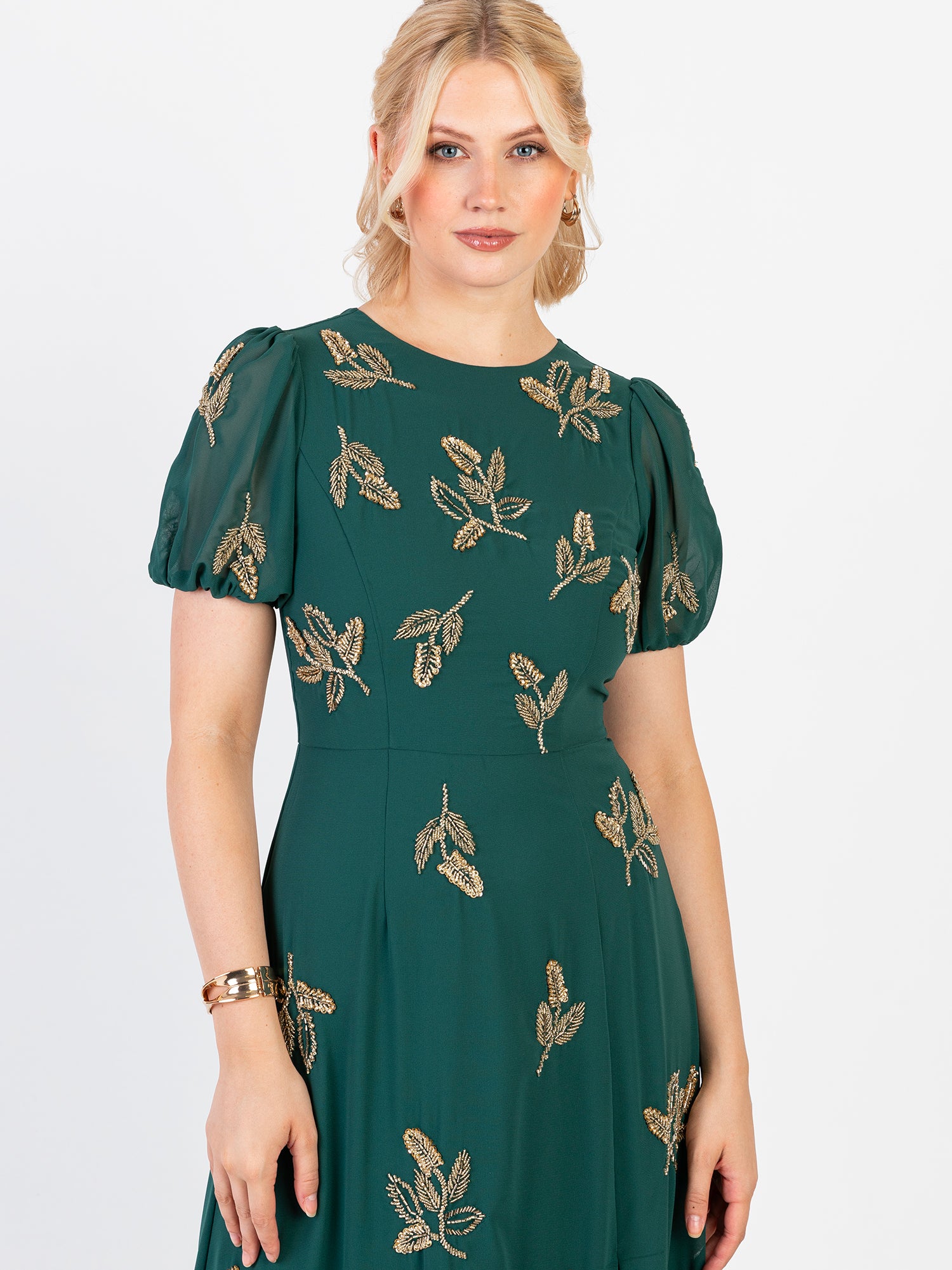 Discover the epitome of sophistication with one of our most popular maxi dresses, blending refined beauty with eternal embellishments. Crafted from luxurious Emerald Green chiffon, delicate floral appliques intricately hand-sewn onto the fabric create a captivating effect, making it a must-have for your upcoming events. This elegant piece features a classic round neckline and short puffed sleeves, offering a refined contrast to the daring keyhole back adorned with self-tie ribbons, ensuring a flawless fit without the need for additional accessories. For a timeless ensemble, pair this maxi with elegant strappy heels and a coordinating clutch bag, perfect for making an unforgettable entrance wherever you go.