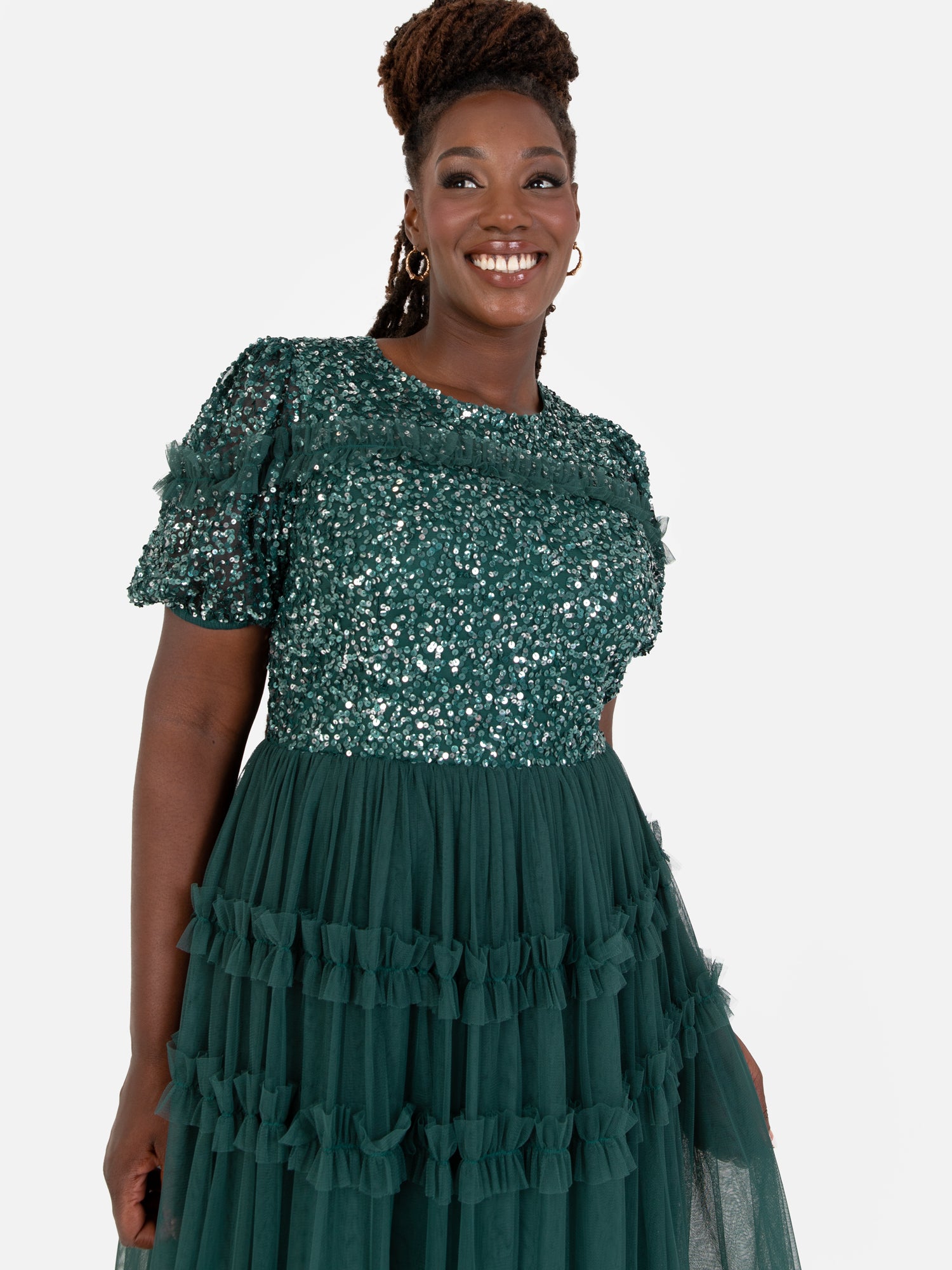 This dress is designed for those who appreciate the finer details and seek to make a statement with their style. Shimmering embellishment adorns the short-sleeved bodice fitted with an invisible zip fastening to the reverse allowing for an effortless look from the front and to the back. The frill detailing carefully arranged along the sleeves and skirt add a whimsical touch and enhances the dress's overall charm. Style this Emerald Green midi with lightly coloured footwear and loose curls for a day event or opt for black strappy heels and a sleek up-do for an evening party.