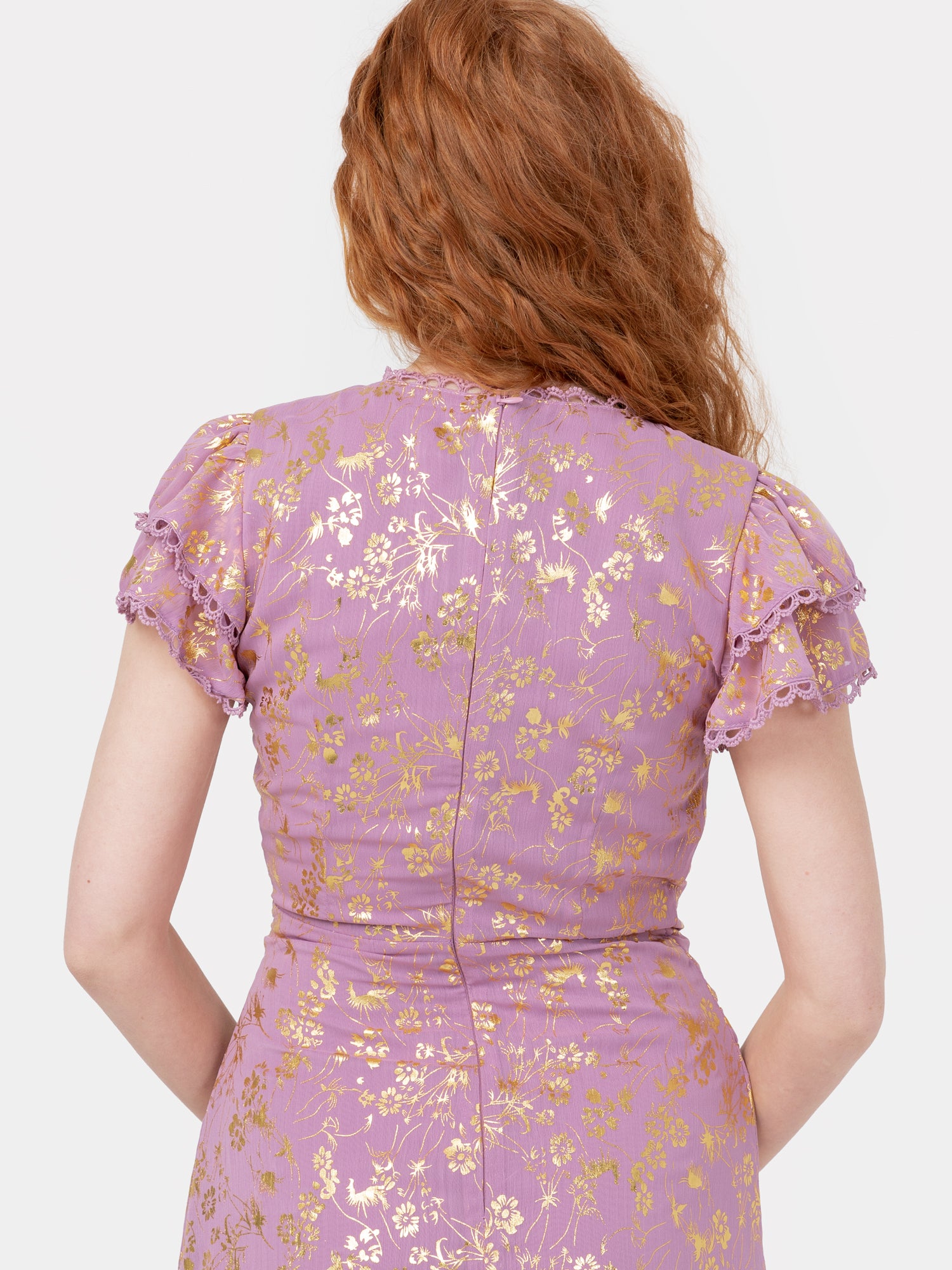 This elegant muted maxi exudes sophistication with its intricate detailing. Romantic draping of the fabric cascades gracefully into a faux wrap design creating a flattering A-line silhouette and in turn drawing the eye to the waistline adorned with a beautiful rose corsage. Gold foil florals and lace trims adorn the dress forming an exquisite blend of intricate and glamorous detail. Style this dress with dark purple heels and gold accessories for a romantic finish that will leave a lasting impression.