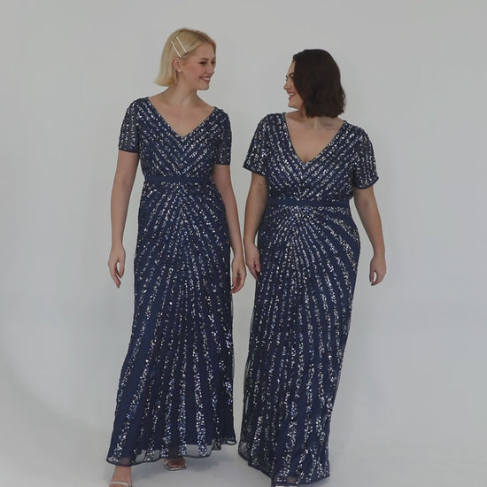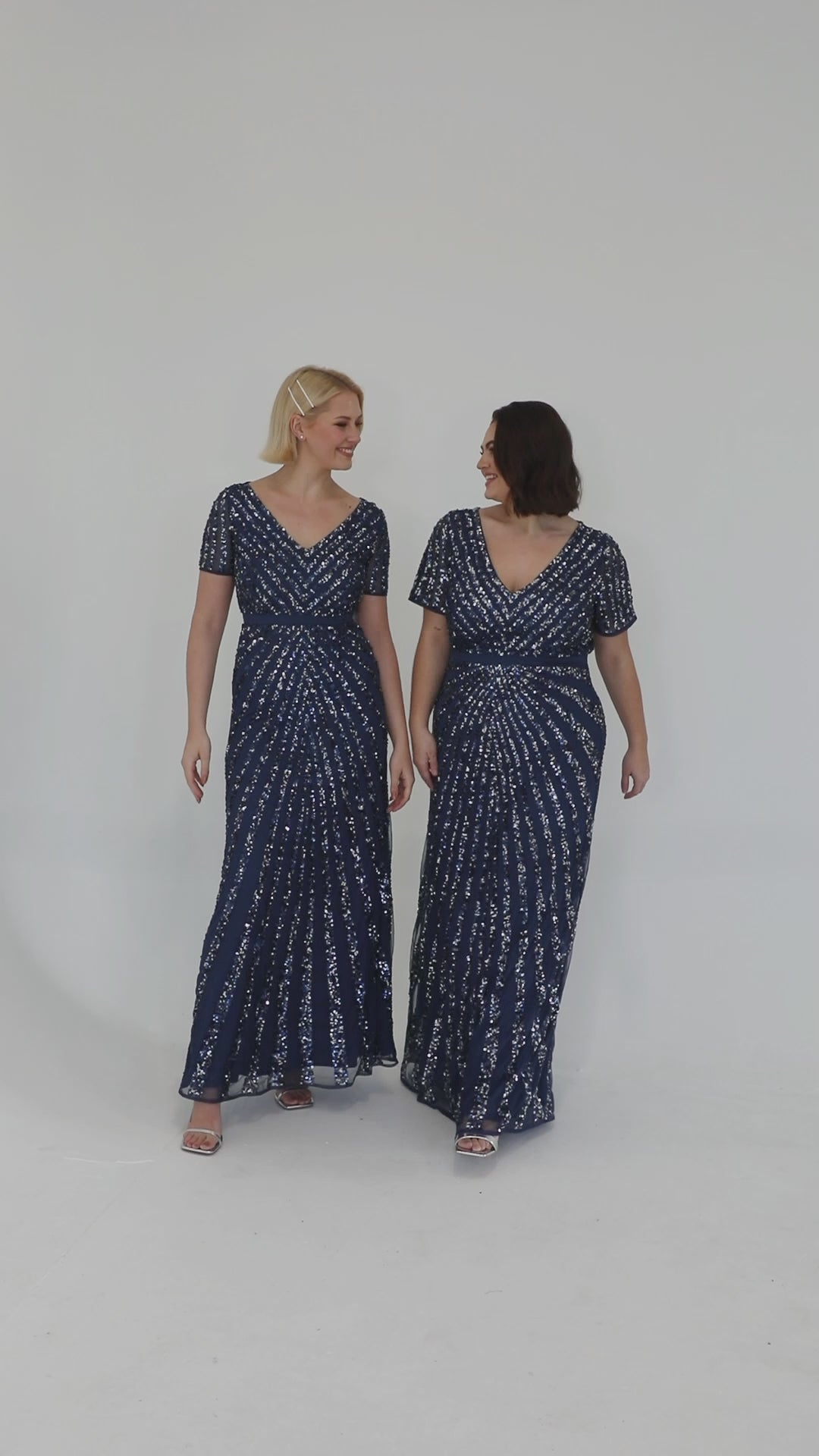 Made for evening balls and red carpet events this French Navy gown will complement your figure with a fitted bodice and lightly flared maxi skirt. Radiating from the waist are hand sewn silver sequin stripes that create an immersive feeling not just for yourself but everyone in the room. For a showstopping look style this dress with Hollywood waves red lip and strappy heels.