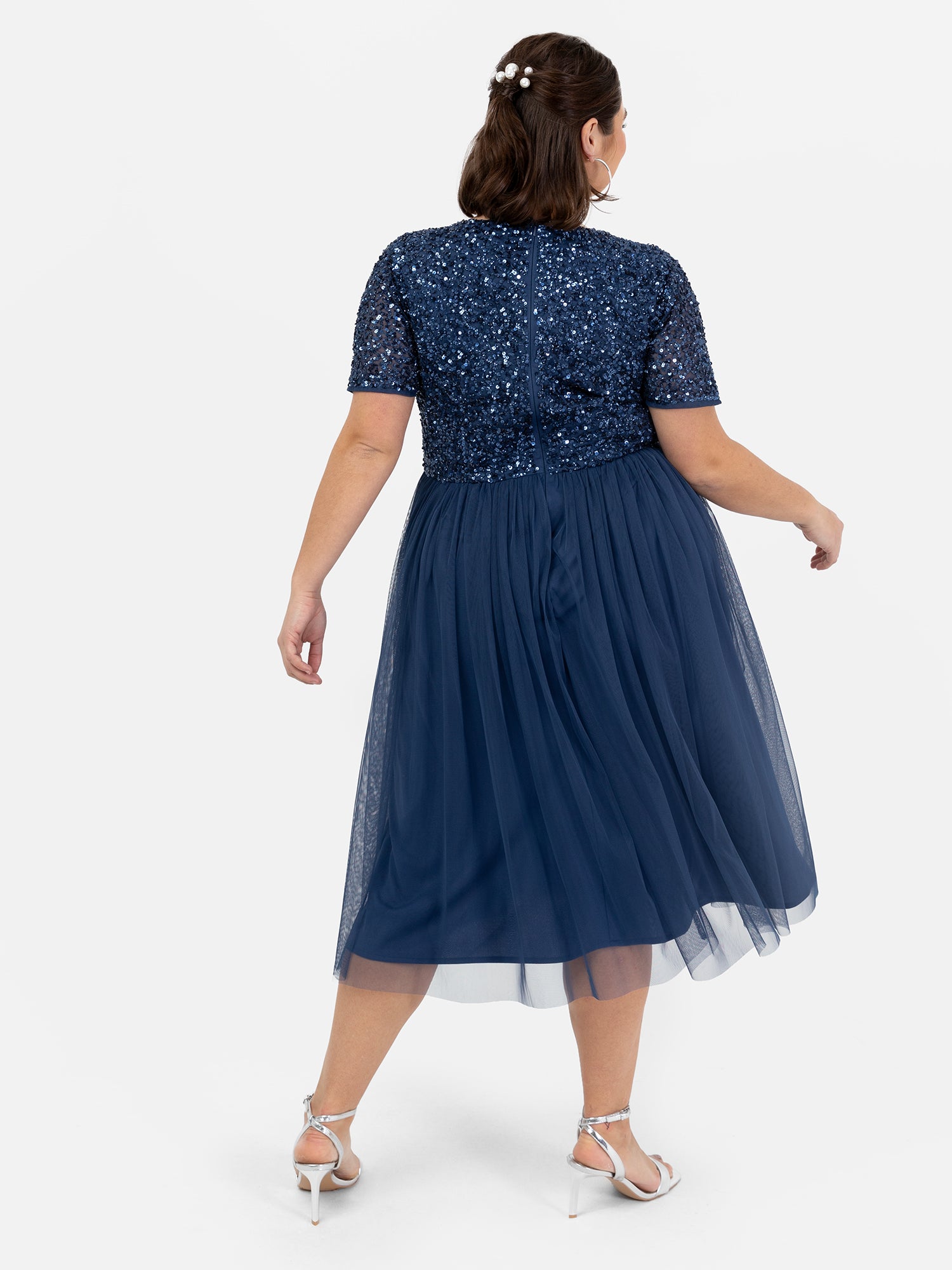With a little twist on our most popular bridesmaids dress this midi version is a perfect choice for summer weddings and other special occasions. Maya’s adored hand sewn sequin embellishment over the fitted V neck bodice gives this dress enough sparkle to twinkle at the altar while the soft tulle skirt flowing from the cinched waist complements the figure with its A line shape.