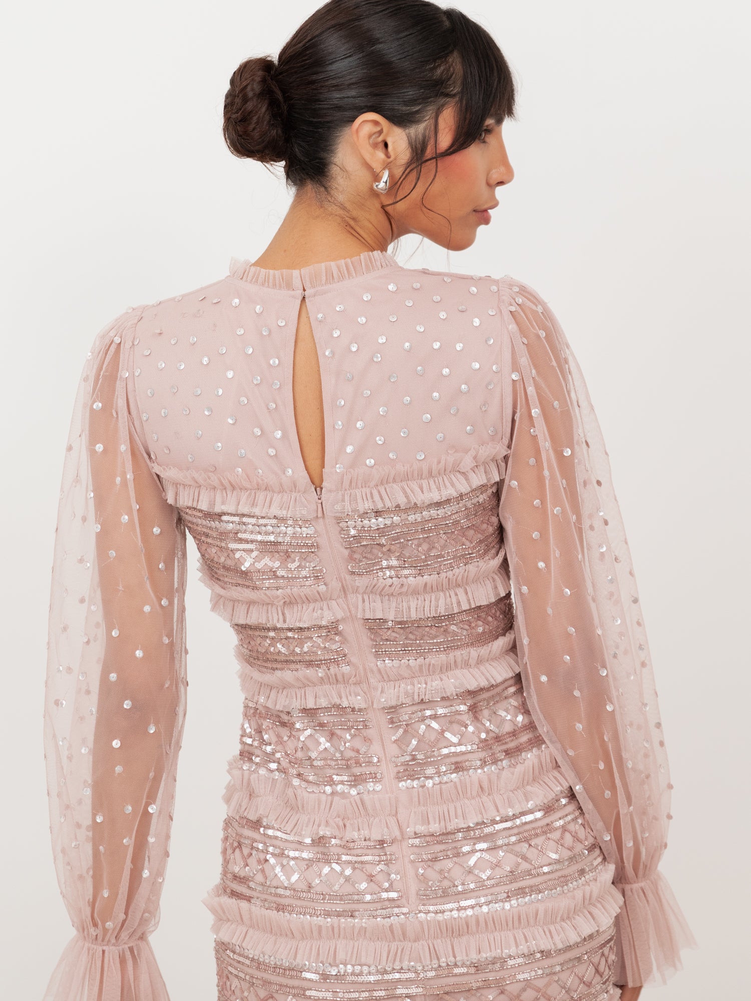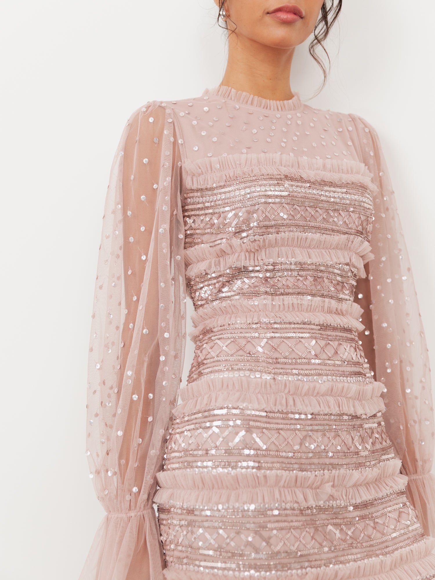 Maya Frosted Pink Sequin & Frill Maxi Sleeve Tulle Maxi Dress