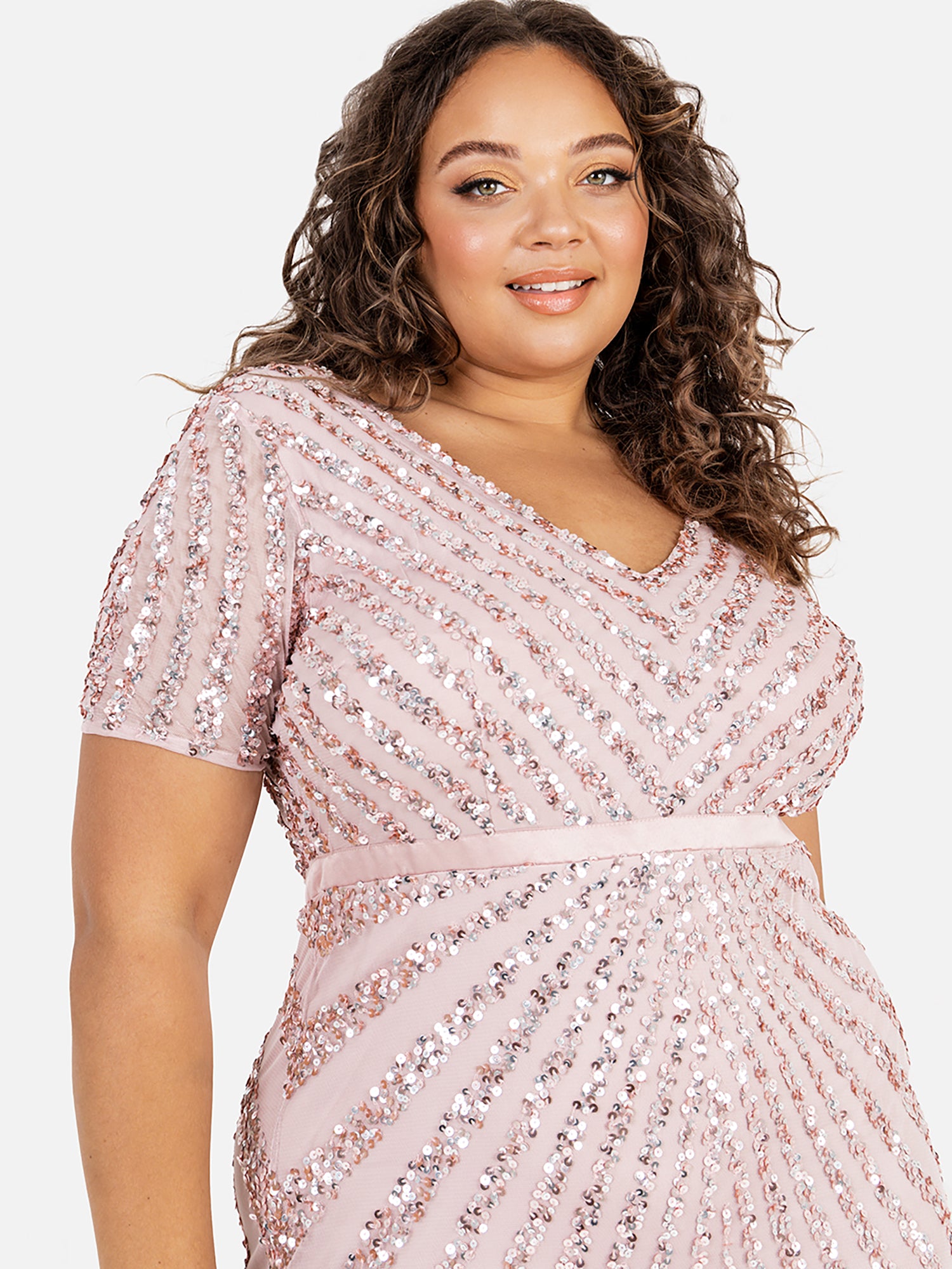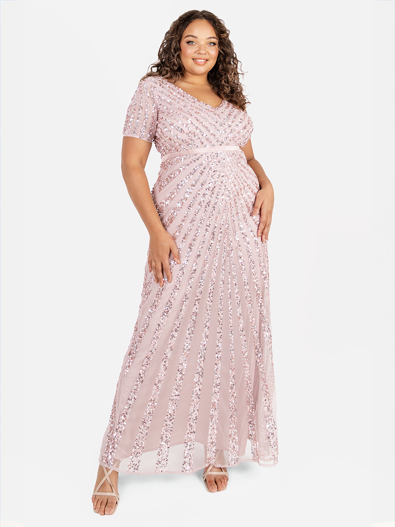Made for evening balls and red carpet events this Frosted Pink gown will complement your figure with a fitted bodice and lightly flared maxi skirt. Radiating from the waist are hand sewn silver sequin stripes that create an immersive feeling not just for yourself but everyone in the room. For a showstopping look style this dress with Hollywood waves red lip and strappy heels.