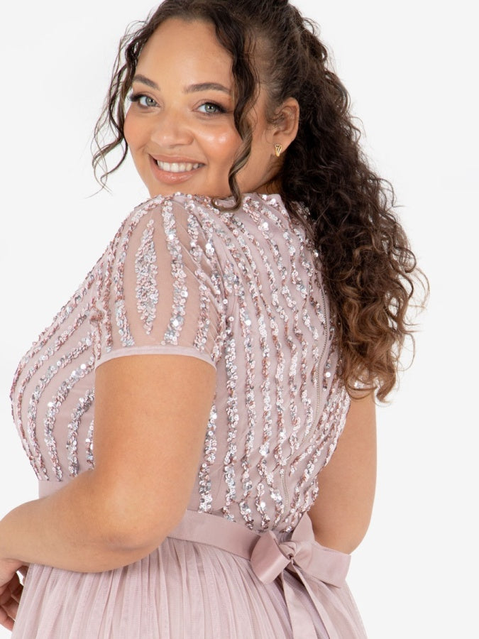 Our most popular bridesmaid style is now available in this stunning Frosted Pink shade! At the heart of this dress lies a meticulously arranged stripe embellishment that follows the lines of the classic V Neckline and strikes contrasting angles on the sheer short sleeves. A-line shape is crafted from delicately draped tulle fabric forming a flattering silhouette while the satin sash belt sitting atop the waist adds a charming finishing touch and further accentuates the figure.