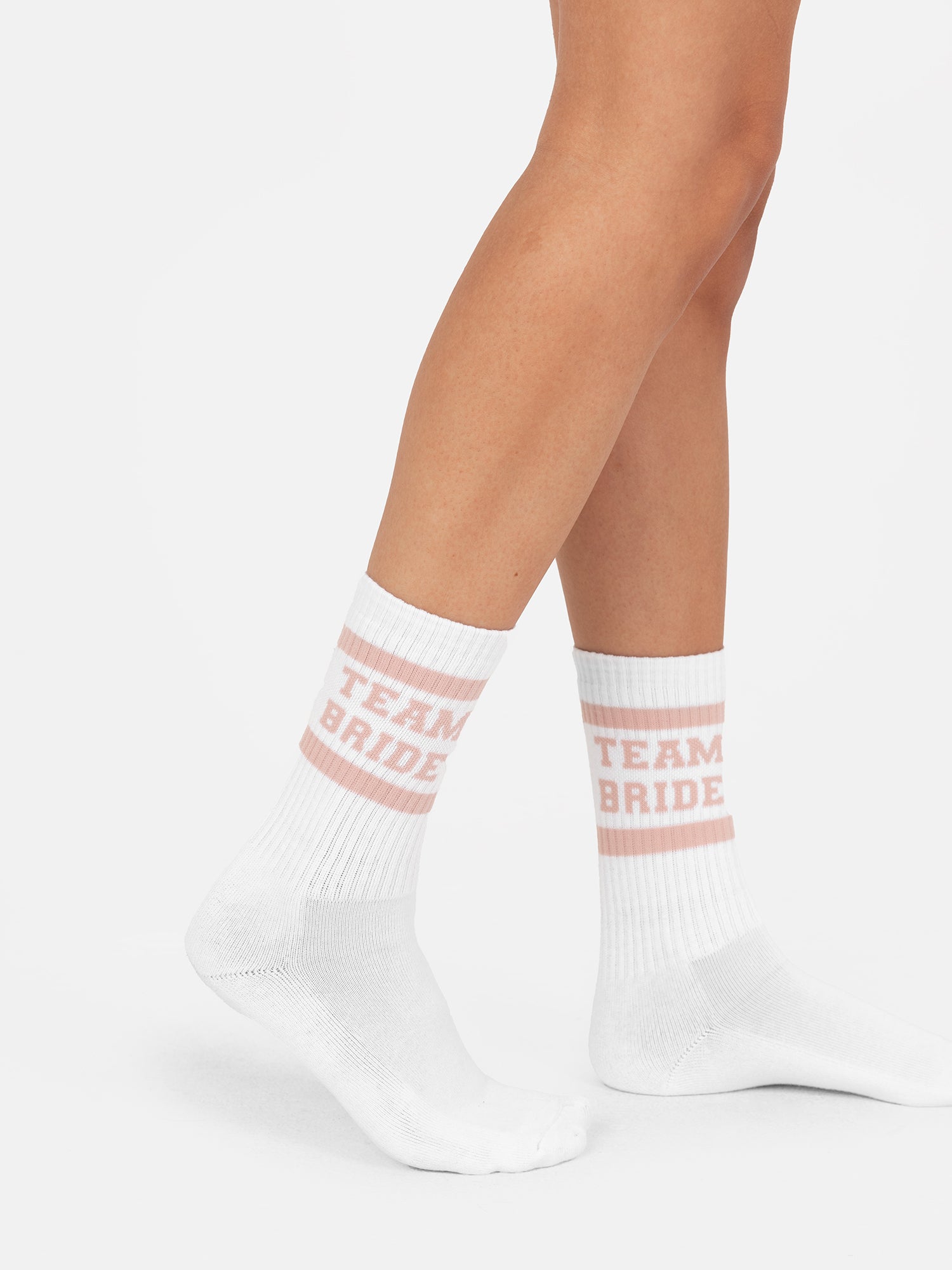 Whether for the hen do or the big day itself these retro style socks are a perfect addition to your bridal party ensemble. Crafted in a crisp white shade these socks feature a "Team Bride" slogan in our most popular Frosted Pink shade for a charming contrast. Designed for all-day comfort these socks boast a smooth knit finish linked toe seams and ribbed elasticated legs and cuffs.