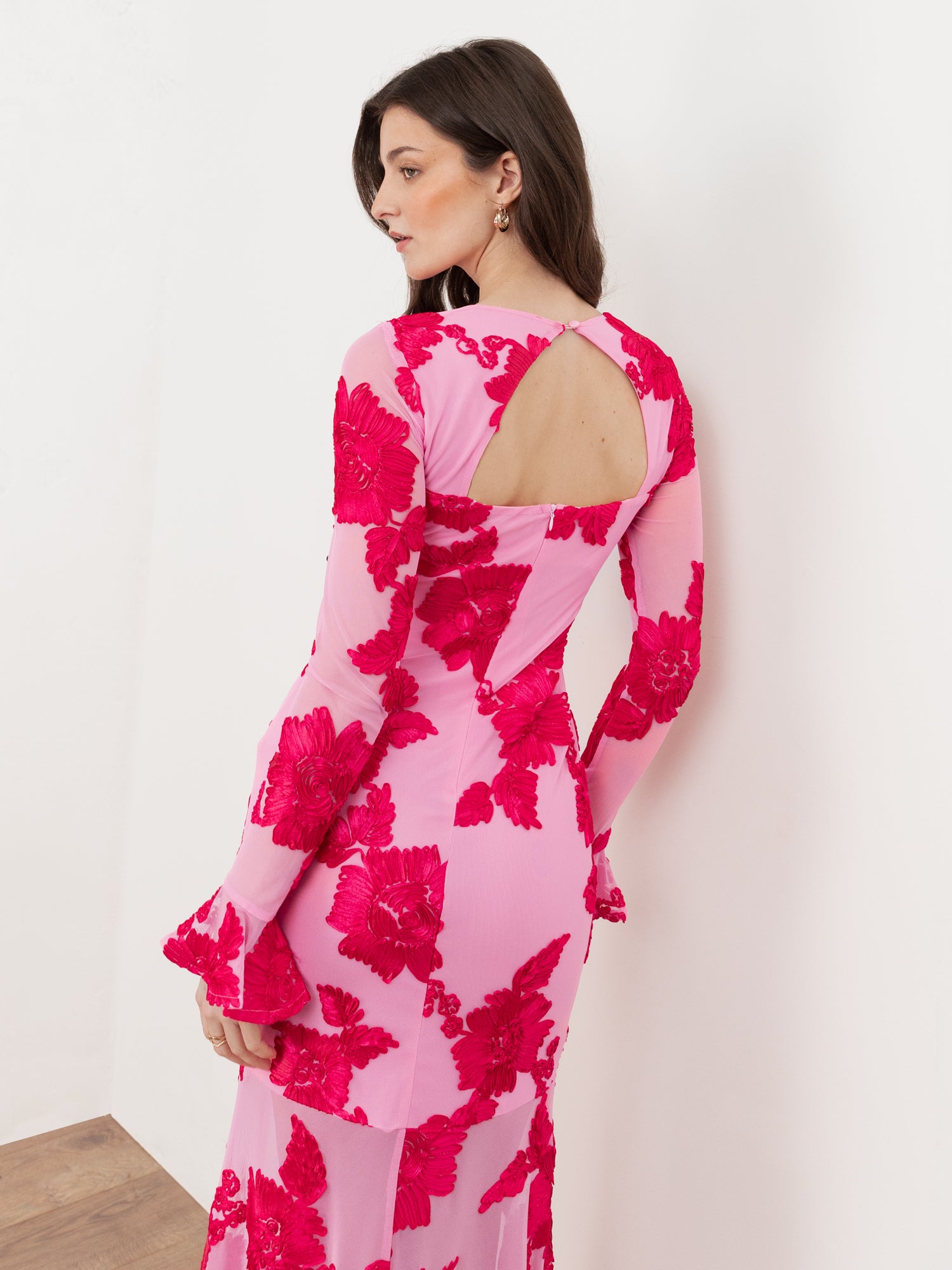 A statement in modern romance, this dress is crafted from soft pink mesh, making it a playful choice for summer occasions. Intricately detailed with hot pink ribbon embroidery, it features striking three-dimensional floral motifs throughout. The form-fitting silhouette is framed by a classic round neckline and sheer long sleeves, balancing elegance with allure. Lined to a flattering mini length, the design reveals a sheer panel that gently flares from the knee for added movement and drama. A delicate keyhole detail at the reverse completes this captivating style. Pair with hot pink accessories for a bold finish or style simply with gold heels and dainty earrings.
