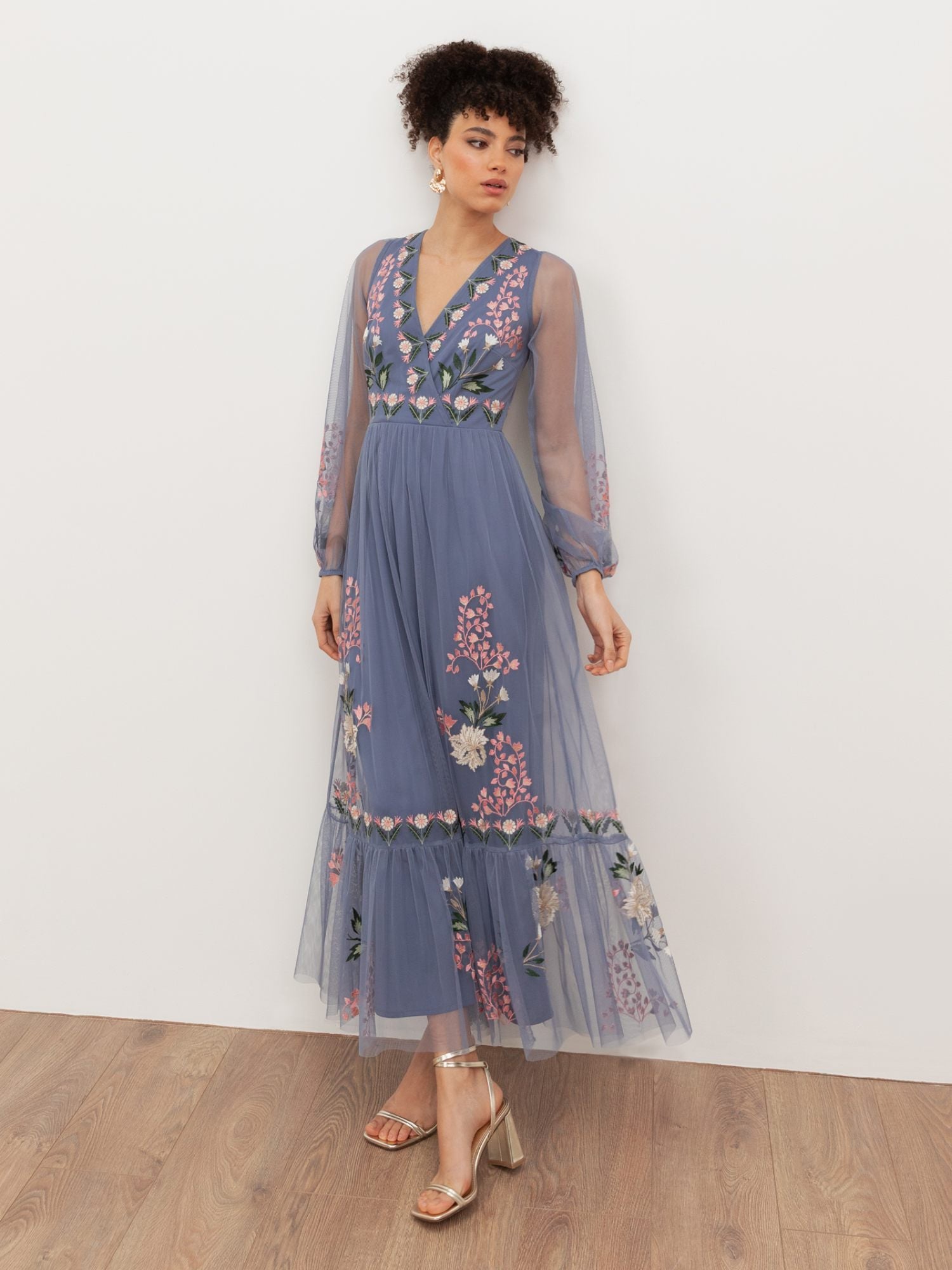 For an unforgettable entrance, this blue floral gown offers a masterclass in modern elegance. Exquisitely crafted from whisper-soft tulle, it is adorned with intricately hand-sewn floral embroidery that cascades across the bodice and ankle-skimming skirt. The sheer long sleeves introduce a contemporary allure, while the faux-wrap bodice lends a beautifully feminine finish. Falling to a flattering midaxi length, the A-line silhouette is softly structured with delicate ruffles from the gathered waist and a subtle hem panel, creating flowing movement with every step. Complete your ensemble by selecting shoes and accessories that echo the delicate hues of the embroidered blooms for a polished, harmonious look.
