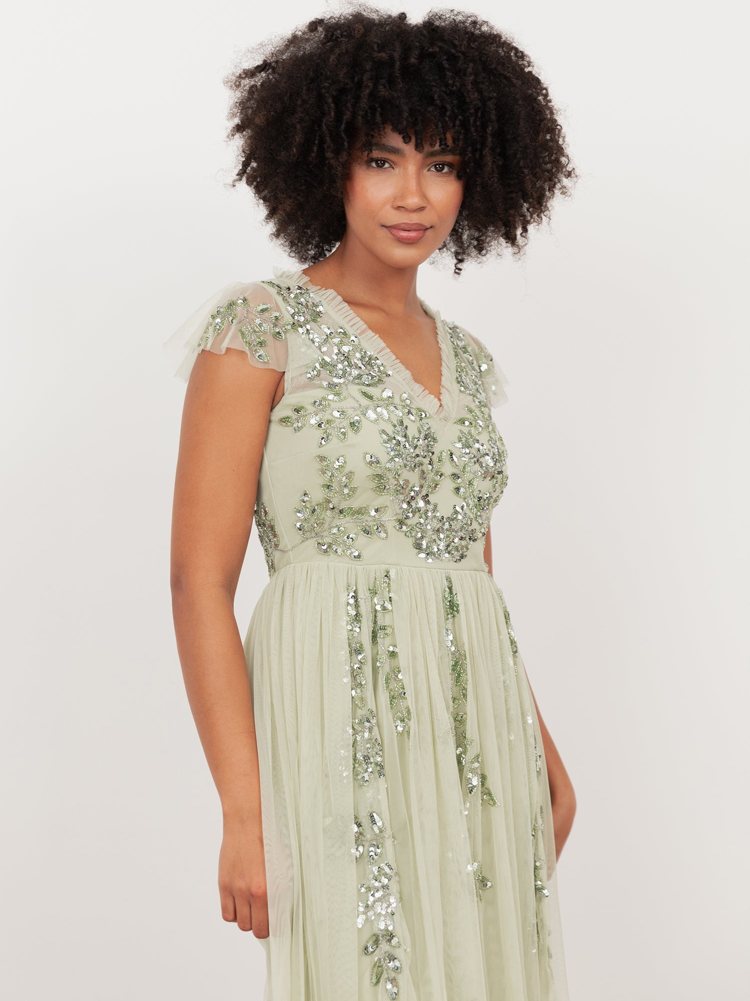 Embrace elegance and leave a lasting impression in our Meadow Green bridesmaid midi. Expertly crafted from the finest tulle in a delicate green hue, this dress provides a stunning canvas for intricate floral embellishments that adorn both the bodice and skirt. A classic V-neckline trimmed with soft frills and sheer flutter sleeves offer a romantic contrast to the daring open back, eliminating the need for additional accessories. Falling to a midi length, this gathered A-line style is perfect for warmer wedding ceremonies and daytime celebrations. Simply pair with silver heels and a sleek up-do to showcase every detail of this beautifully embellished dress.