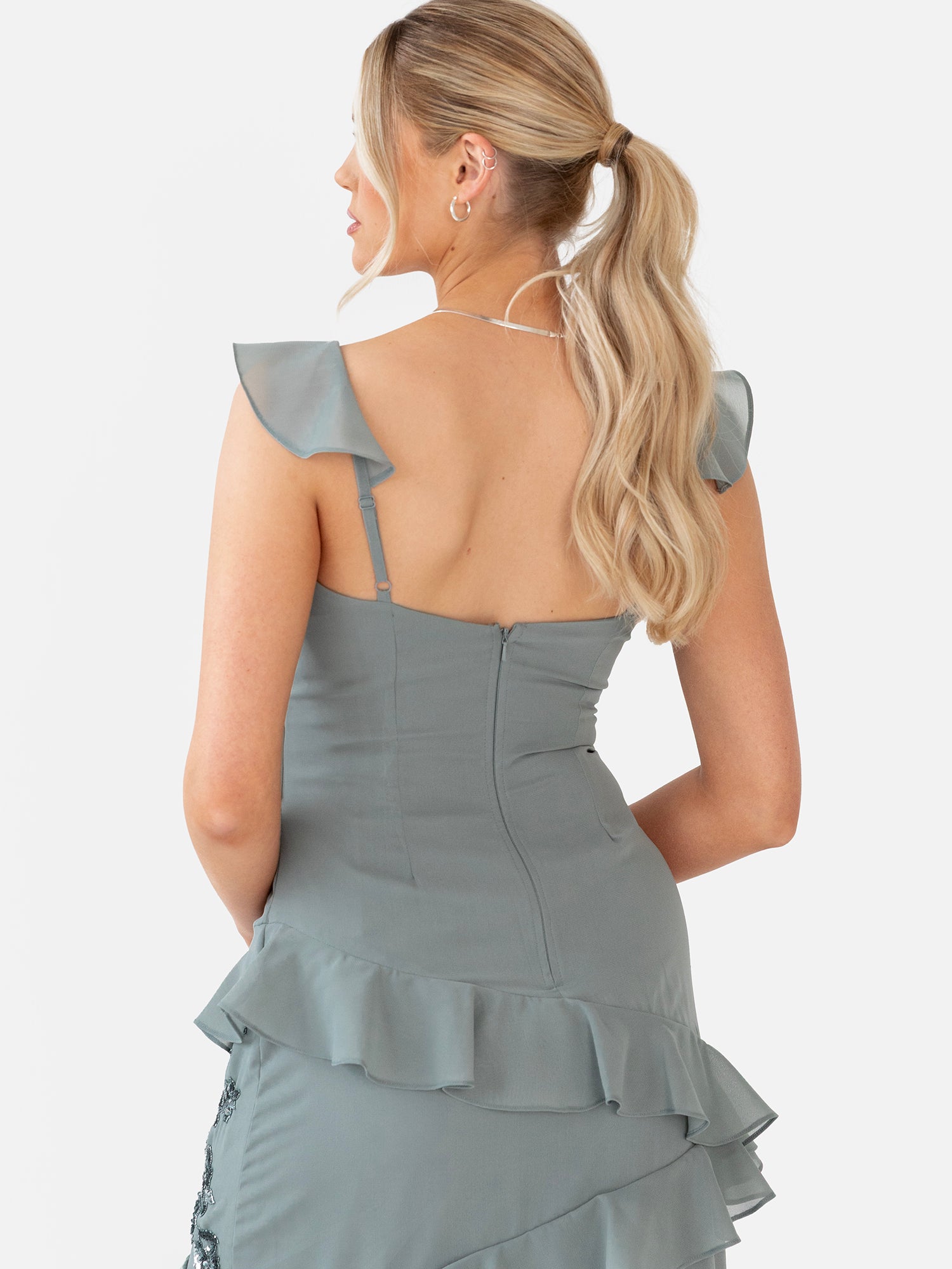 Discover Maya?s Winter Bridesmaid Collection, where shimmering florals and captivating ruffles meet timeless silhouettes. This elegant misty green maxi dress features delicate floral embellishments and tiered ruffle accents that cascade from adjustable straps, crossing gracefully at the fitted bodice to create a flattering empire waistline. Asymmetric ruffles flow through the maxi skirt, adding soft movement and sophisticated charm. Perfect for the modern bridesmaid or any evening celebration, this gown pairs beautifully with silver heels and delicate jewellery for a refined look.