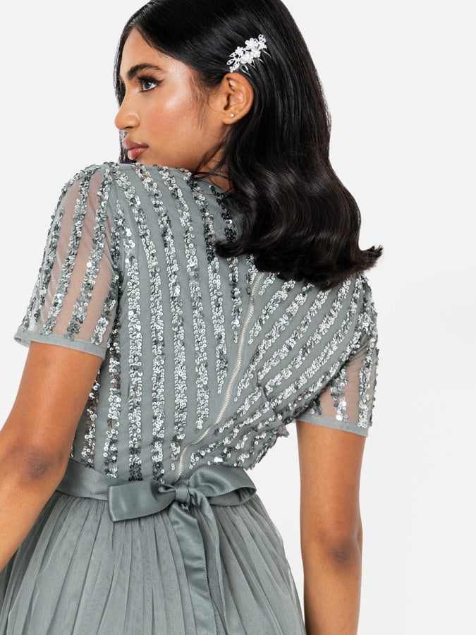 Our most popular bridesmaid style is now available in this stunning Misty Green shade! At the heart of this dress lies a meticulously arranged stripe embellishment that follows the lines of the classic V Neckline and strikes contrasting angles on the sheer short sleeves. A-line shape is crafted from delicately draped tulle fabric forming a flattering silhouette while the satin sash belt sitting atop the waist adds a charming finishing touch and further accentuates the figure.
