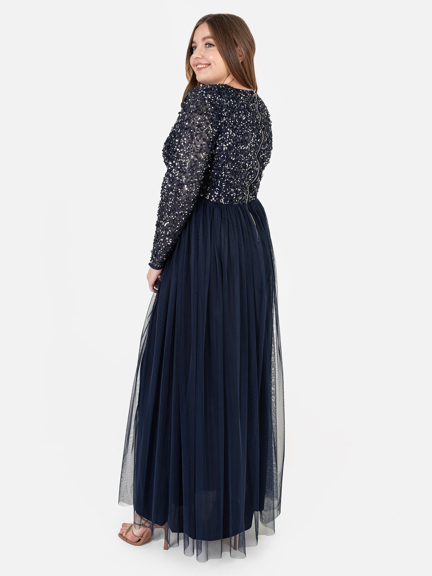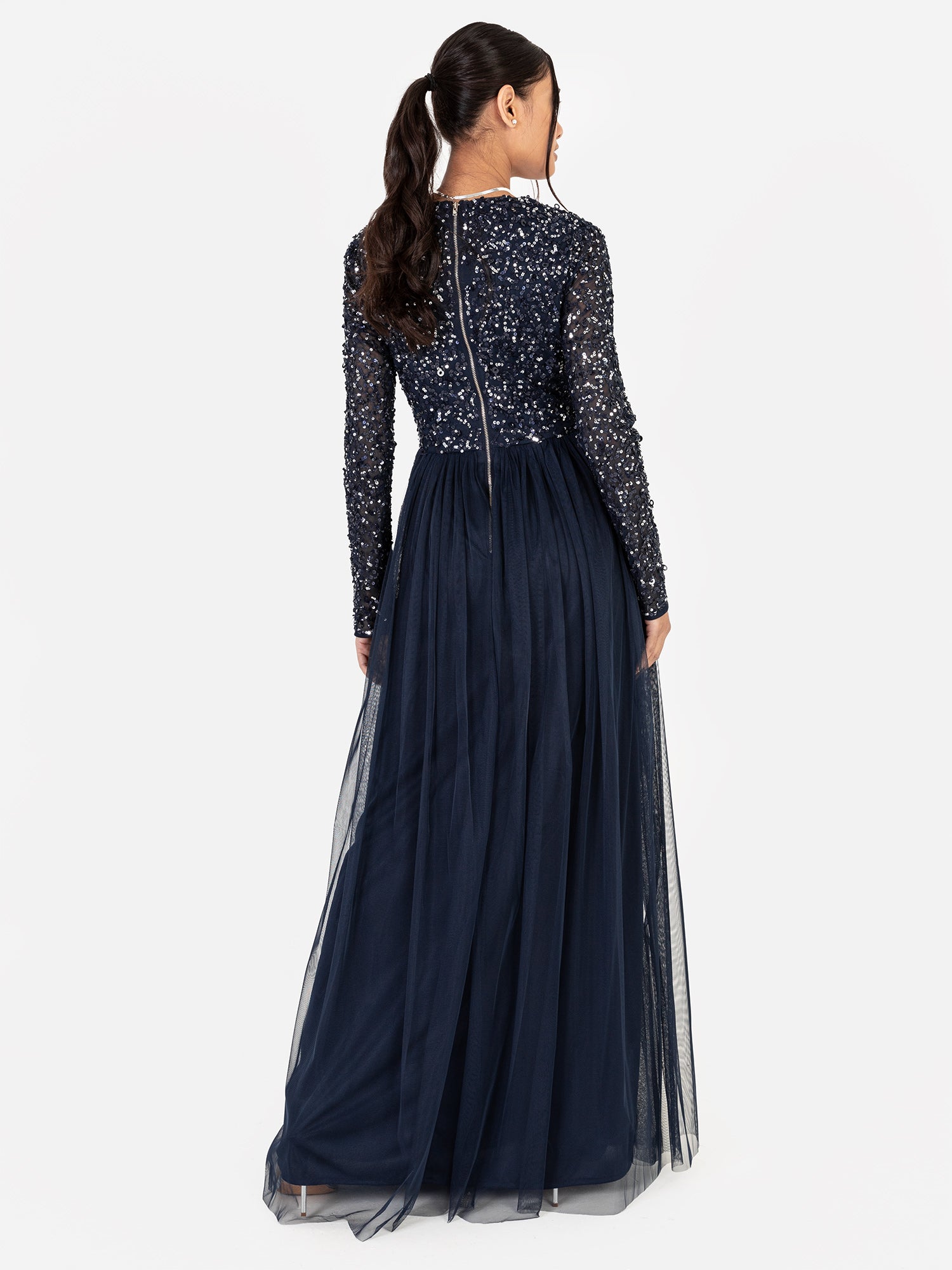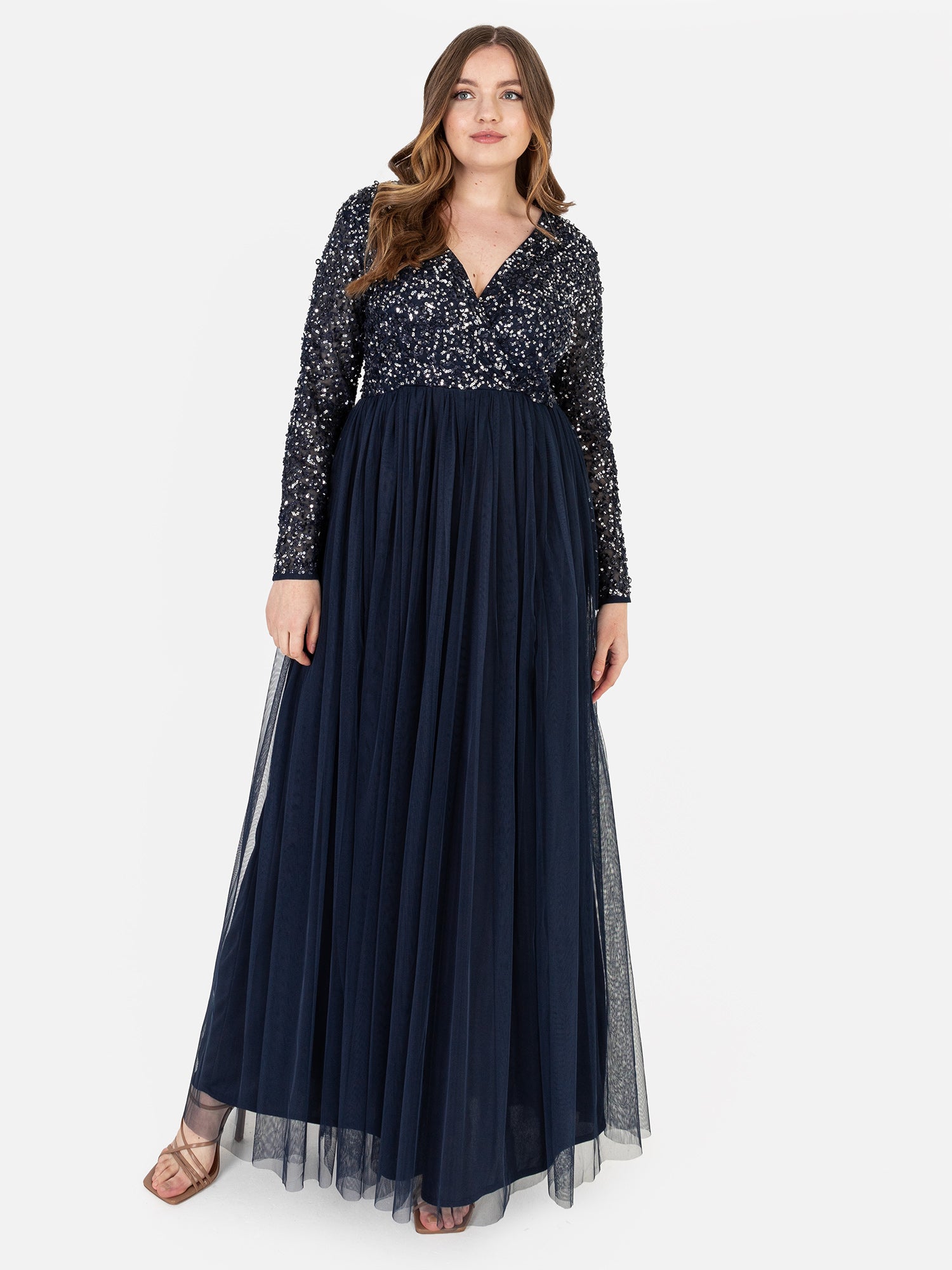 Achieve effortlessly glamorous style with this maxi Navy dress. Designed with intricacy in mind this long sleeve and faux wrap bodice with deep V Neckline is drenched with sequin embellishment. Different shapes and sizes of the sequin reflect the light in their own way adding depth and sophistication to this dress. Whereas the soft tulle midi skirt is a whimsical addition that ties this piece together into a dress you will want to wear over and over again.
