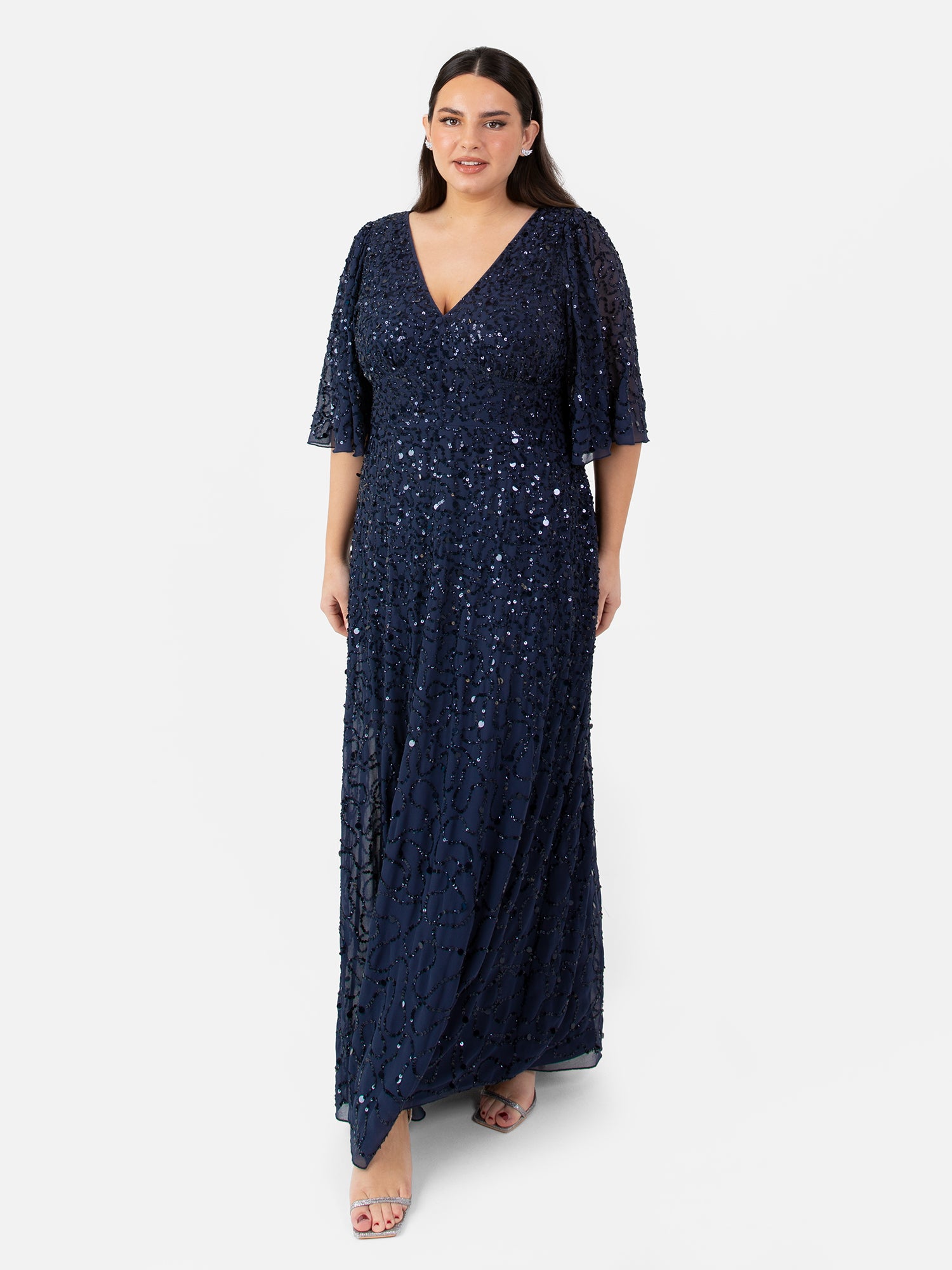 This floor sweeping maxi is sure to be the talk of your next soiree. Maya’s signature cascading embellishment catches the light beautifully drawing attention to the classy angel sleeved bodice. The bodice also features a V neckline cupped bust and cinched panel just above the waist sculpting mesmerising shape. The lightly flared skirt has a flattering A-line silhouette with ruffled hem that creates striking movement with each step. Style this maxi dress with silver jewellery and strappy heels for a look that's sure to have all eyes on you.