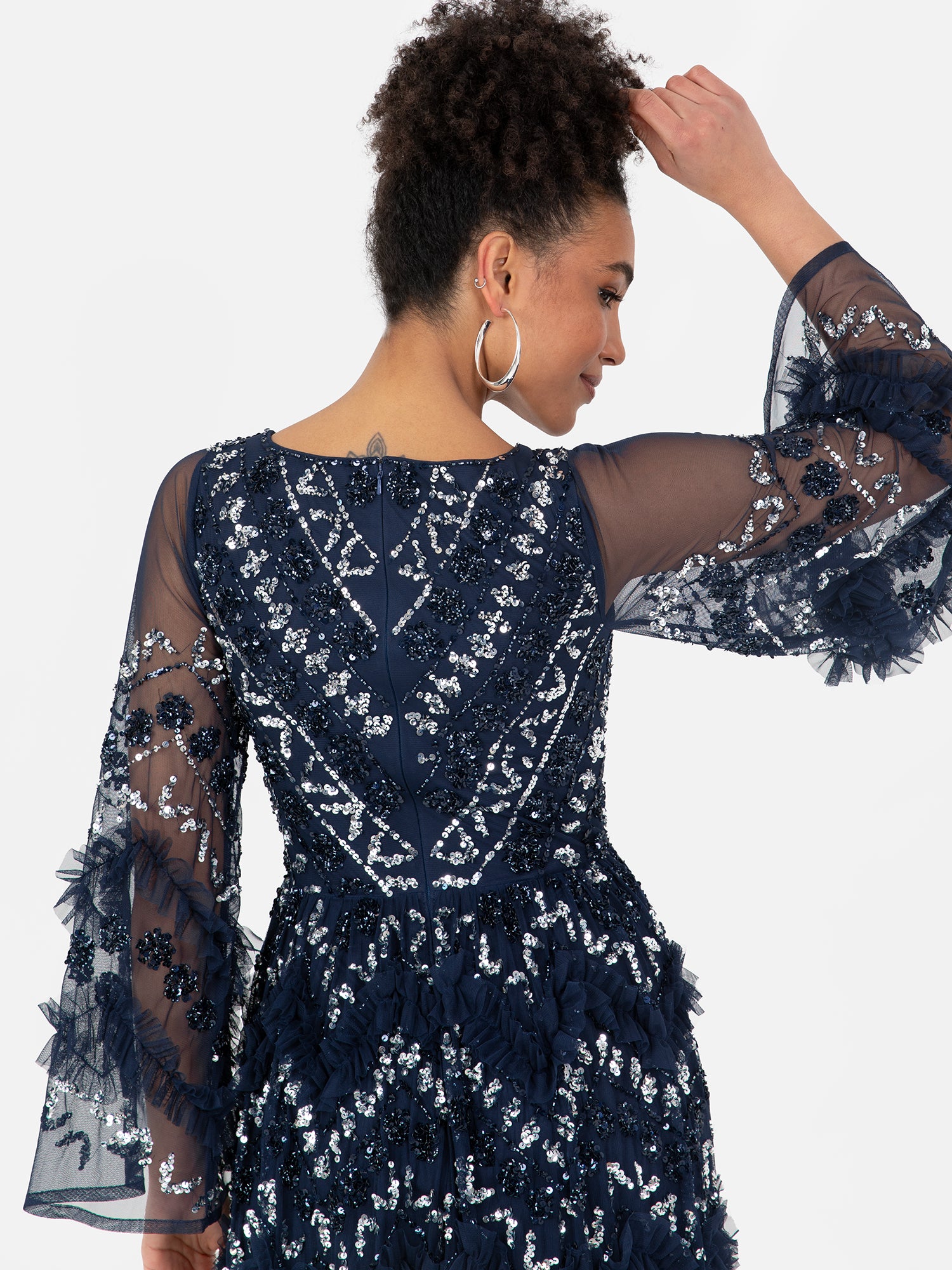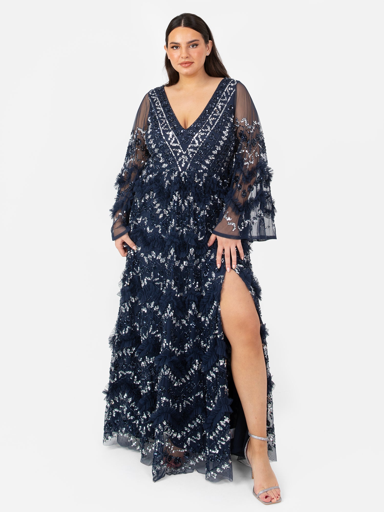 Ethereal yet commanding, this fully embellished maxi dress captures the essence of modern glamour. Adorned with hand-sewn sequins and delicate frill detailing, this gown shimmers beautifully with every movement. The V-neckline and sheer bell sleeves lend a touch of romance, while the thigh-high split introduces a contemporary edge. Falling to the floor, the A-line silhouette flatters the form and moves with effortless elegance, making it a true statement piece for evening soirées and formal occasions alike.