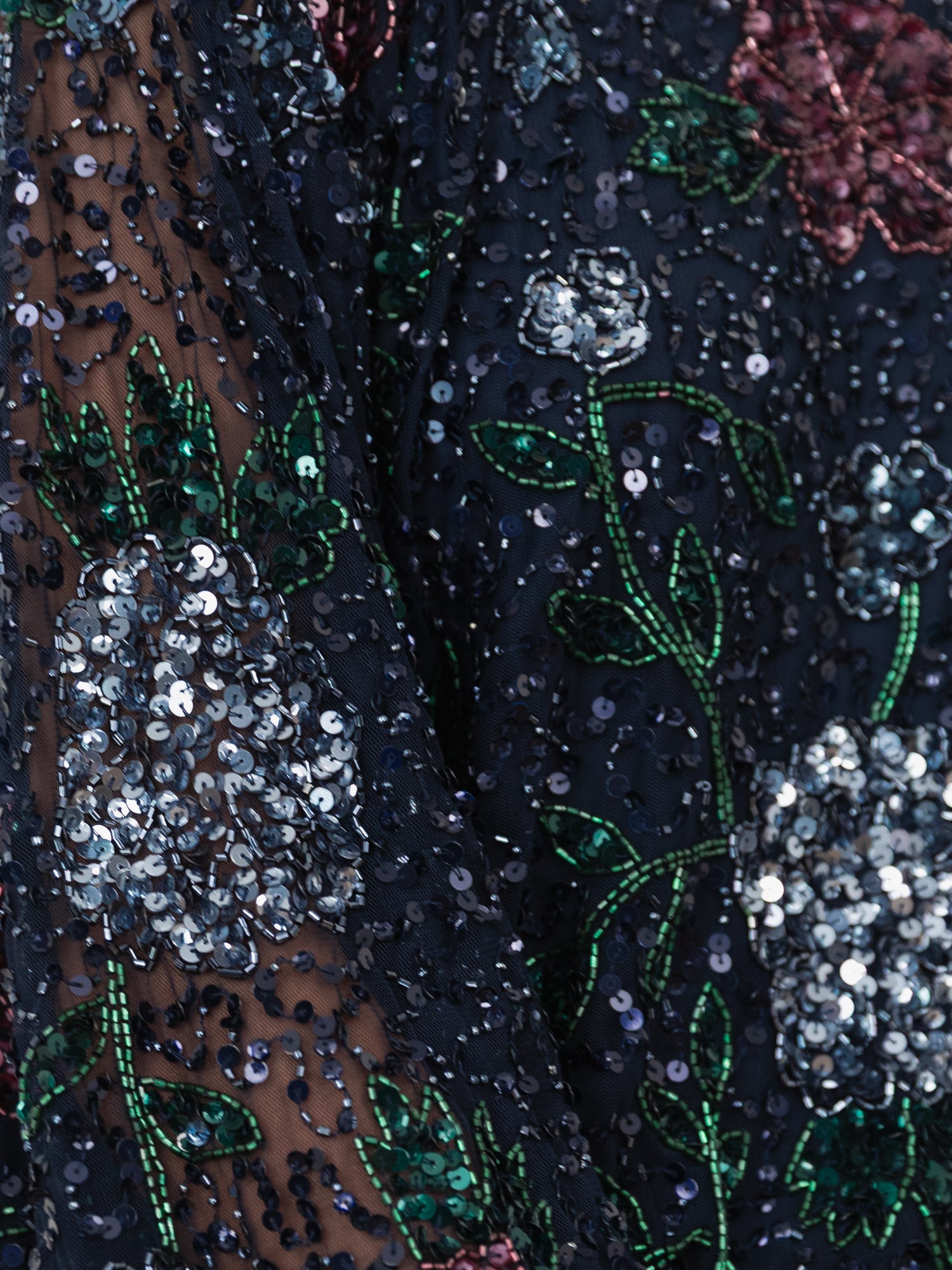 Perfect for special occasions where timeless beauty meets contemporary allure, this maxi dress is crafted from navy tulle with a luxurious body lining and adorned with a breathtaking hand-embellished floral tapestry. The design features a modest round neckline and voluminous blouson sleeves, elegantly finished with elasticated cuffs. The bodice drapes softly at the waist before flowing into a fully embellished A-line skirt that flatters the silhouette with effortless fluidity. Pair with silver heels and delicate earrings for a classic, refined look, or choose bold, colourful accents for a statement-worthy entrance.