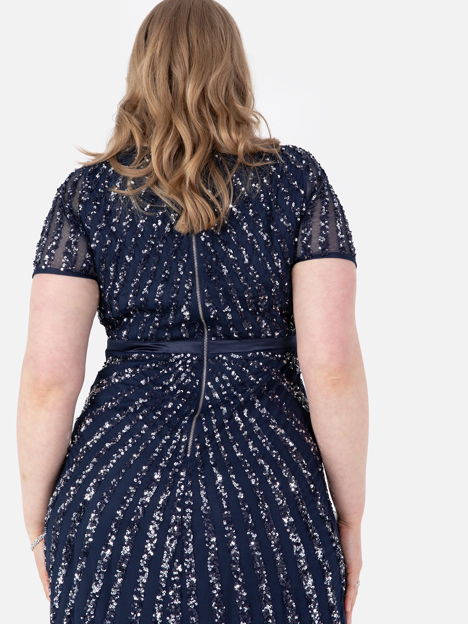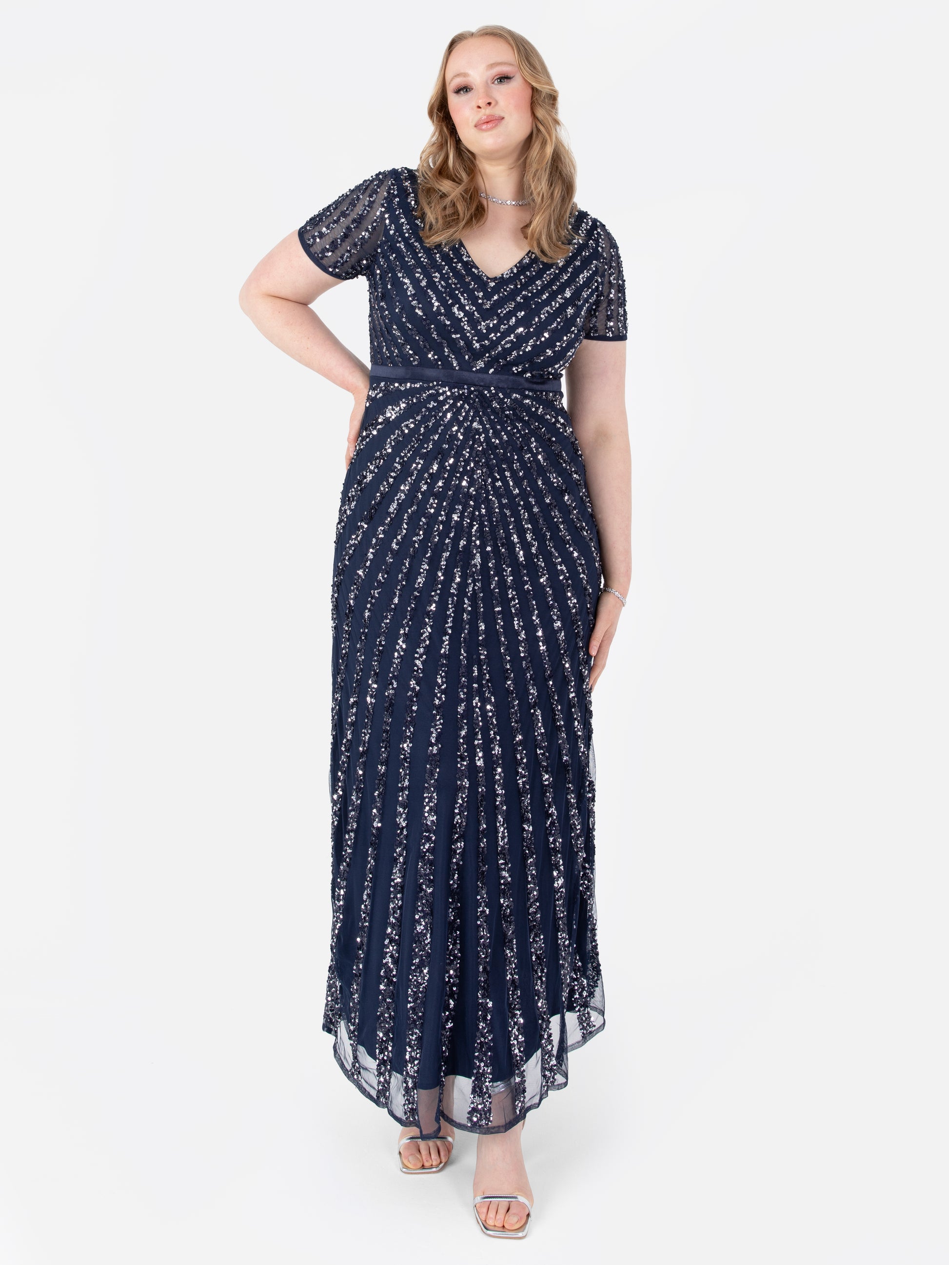 Made for evening balls and red carpet events this Navy gown will complement your figure with a fitted bodice and lightly flared maxi skirt. Radiating from the waist are hand sewn silver sequin stripes that create an immersive feeling not just for yourself but everyone in the room. For a showstopping look style this dress with Hollywood waves red lip and strappy heels.