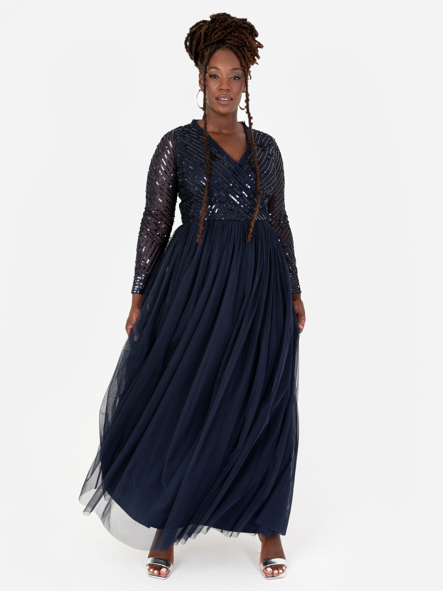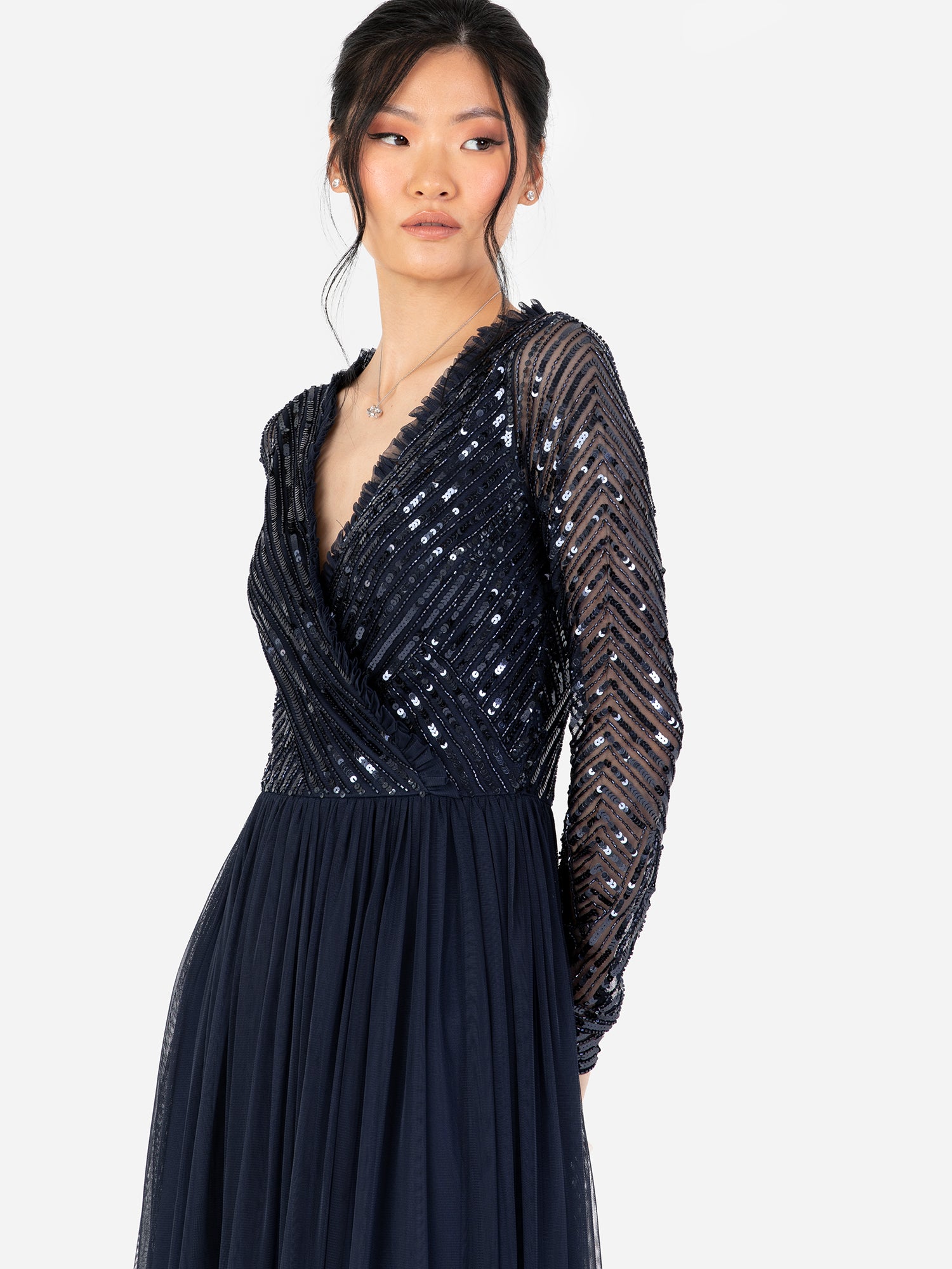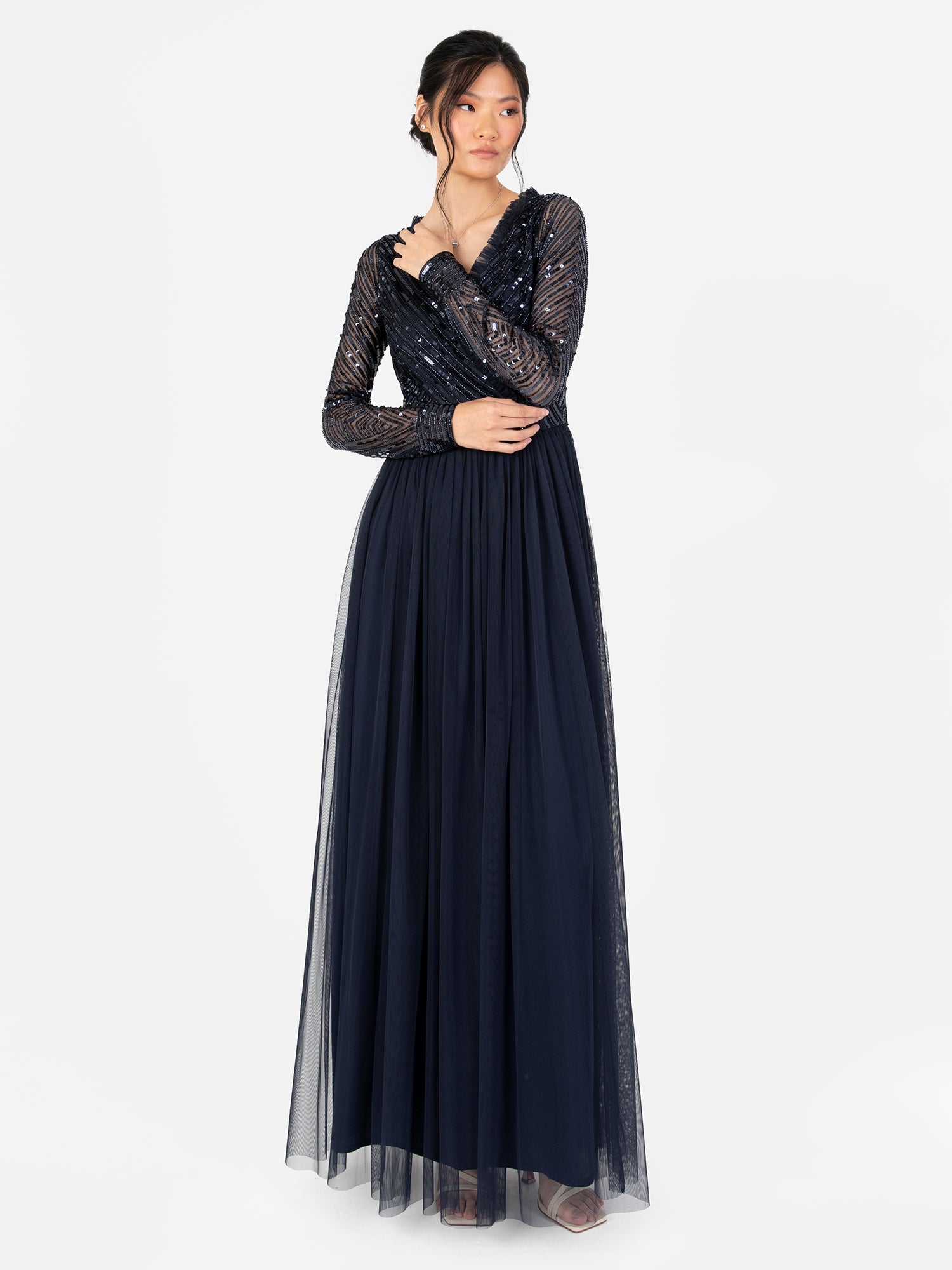 Crafted with precision and attention to detail this dress is made for formal events black tie weddings and other special occasions. Shimmering bodice offers a flattering yet modern look with its precisely placed stripe embellishment that follows the faux wrap bodice and long sleeve lines. Feminine frill detail on the neckline brings a soft romantic aesthetic to the dress. Flattering silhouette is accomplished by a cinched waist and gently ruffled hem that gracefully skims the parquet. Style this maxi gown with Silver strappy heels and a sleek low bun.