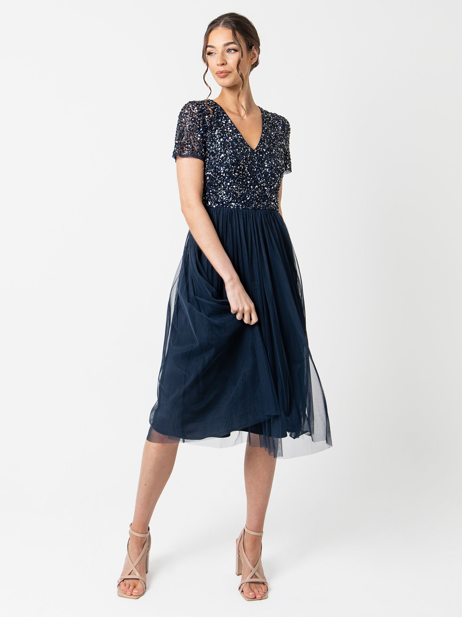 With a little twist on our most popular bridesmaids dress this midi version is a perfect choice for summer weddings and other special occasions. Maya’s adored hand sewn sequin embellishment over the fitted V neck bodice gives this dress enough sparkle to twinkle at the altar while the soft tulle skirt flowing from the cinched waist complements the figure with its A line shape.