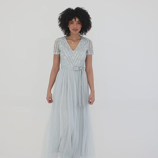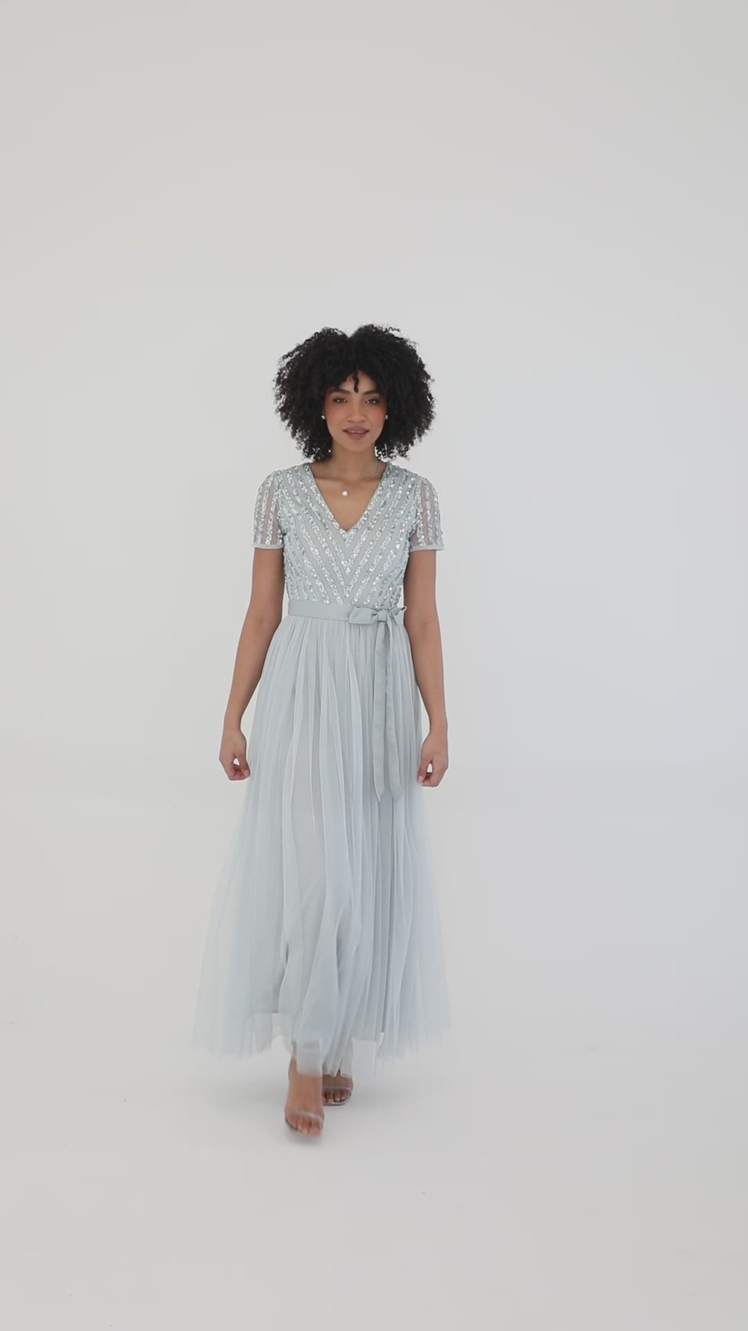 Our most popular bridesmaid style is now available in this stunning Pale Blue shade! At the heart of this dress lies a meticulously arranged stripe embellishment that follows the lines of the classic V Neckline and strikes contrasting angles on the sheer short sleeves. A-line shape is crafted from delicately draped tulle fabric forming a flattering silhouette while the satin sash belt sitting atop the waist adds a charming finishing touch and further accentuates the figure.