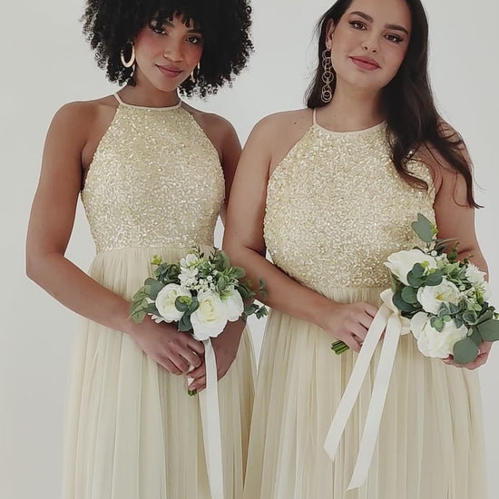 Command attention in this breathtaking maxi gown. The sculpted bodice is adorned with hand-sewn shimmering sequins, catching the light with every movement. Slender straps on the halter neckline lend a delicate balance to the opulent design, while the ethereal tulle skirt cascades to the floor in soft A-line shape. This gown is perfect for bridesmaids, galas, or any evening destined to be remembered. Complete the look with strappy heels and a shimmering clutch for an ensemble that epitomizes modern glamour.