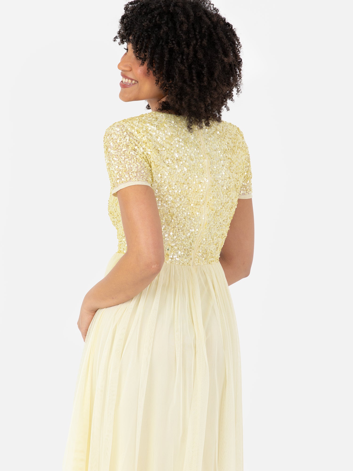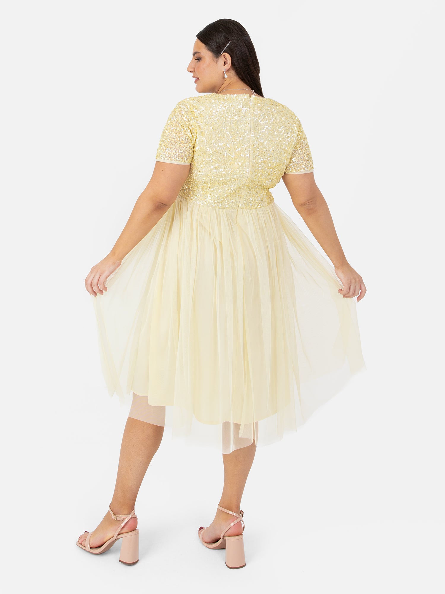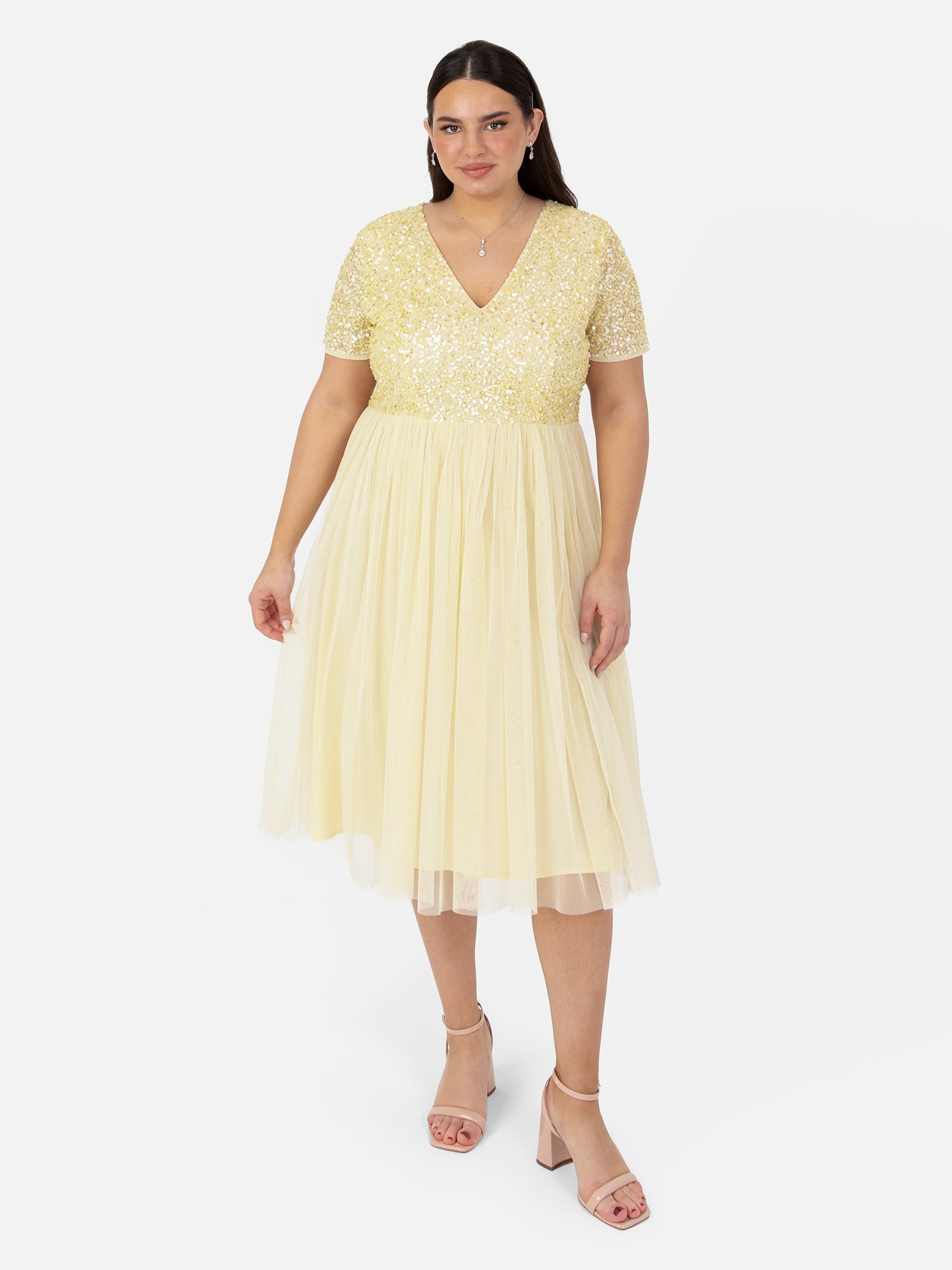 With a little twist on our most popular bridesmaids dress this midi version is a perfect choice for summer weddings and other special occasions. Maya’s adored hand sewn sequin embellishment over the fitted V neck bodice gives this dress enough sparkle to twinkle at the altar while the soft tulle skirt flowing from the cinched waist complements the figure with its A line shape.