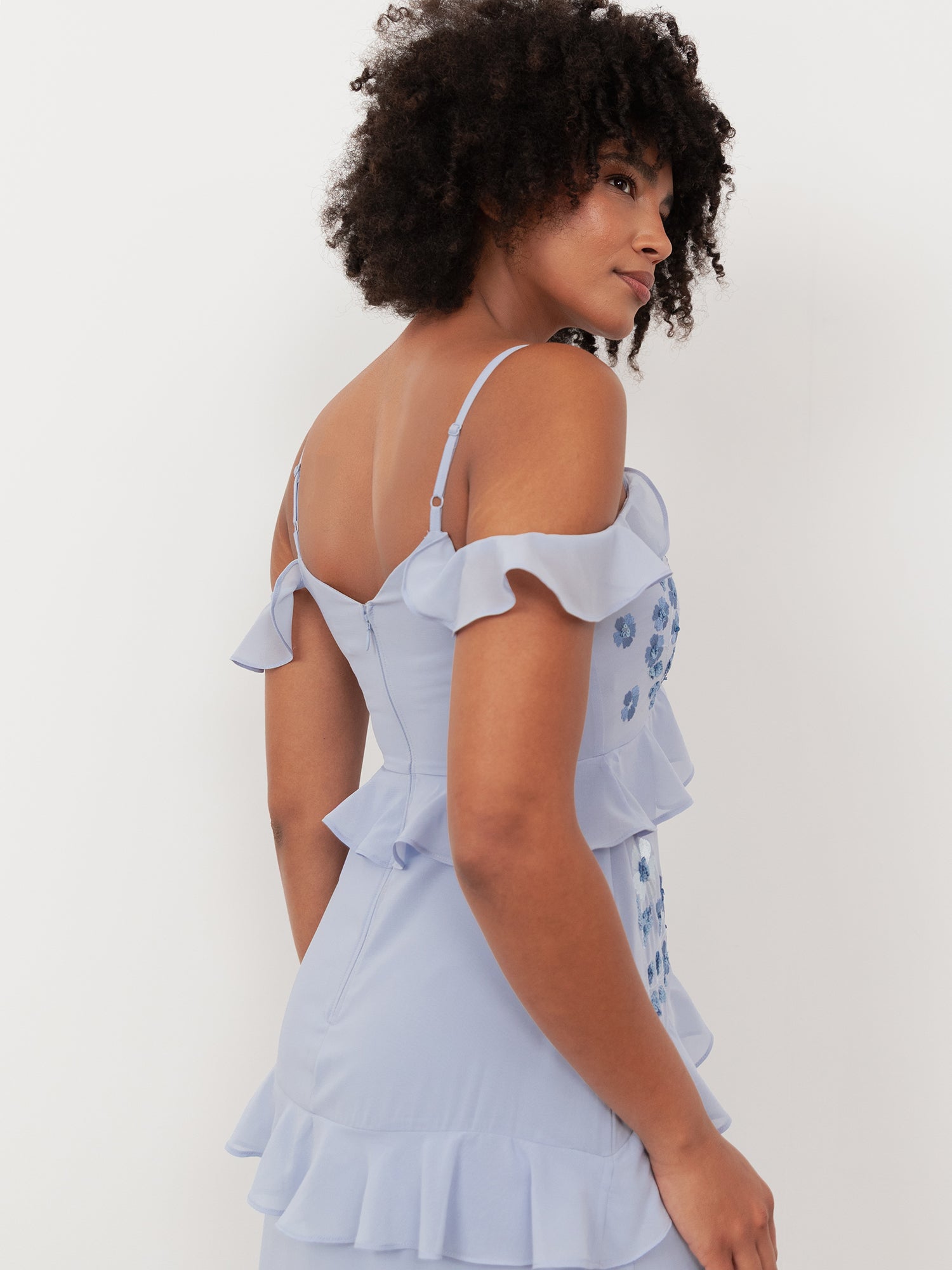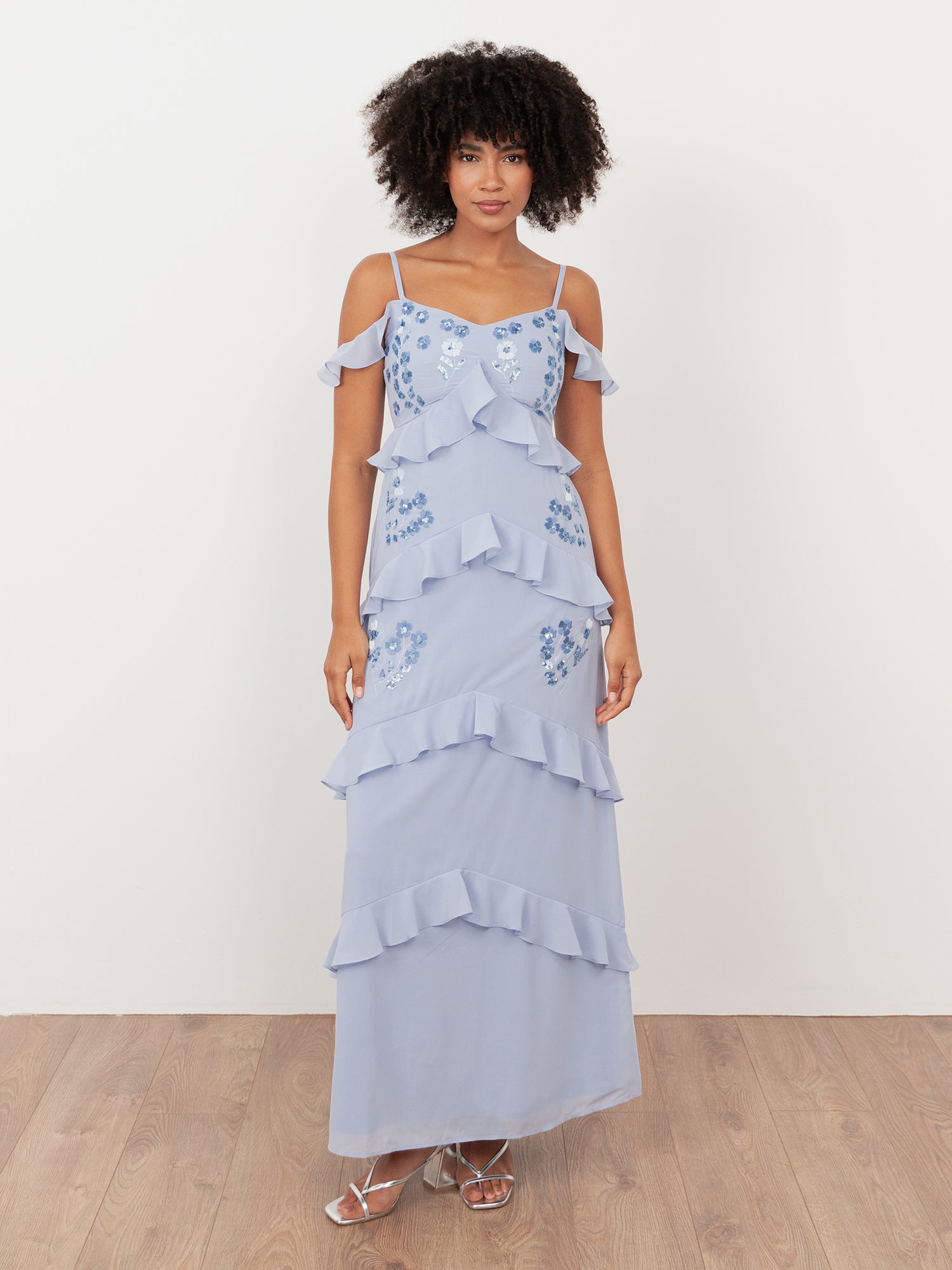 This cold-shoulder maxi dress exudes effortless femininity. It features delicate adjustable straps and soft ruffles that frame the bust, creating a flattering empire waist. The fitted bodice and flowing maxi skirt are adorned with soft floral embroidery in tonal blue shades, accented by shimmering sequins layered between fluttering ruffles. Style this blue maxi dress with pastel accessories for a lovely summer occasion.