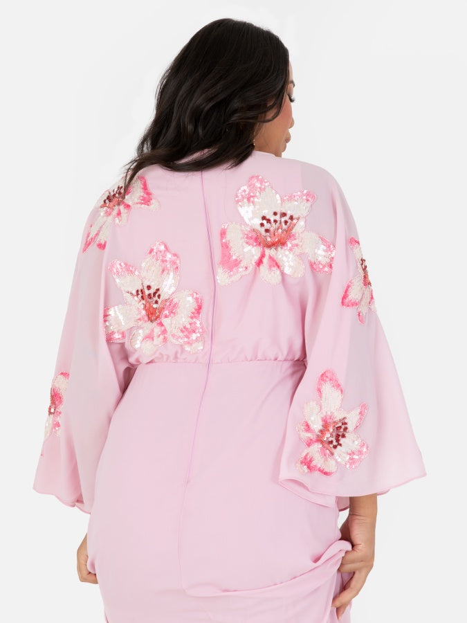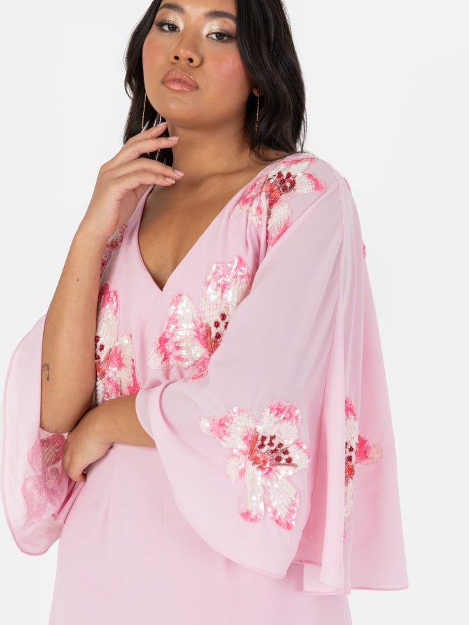 Designed especially for the most memorable of occasions this dramatic Maya dress should be yours! With a statement Kimono-style sleeves this bodice features a chic V neckline subtle waist drape and is adorned with sequin and bead floral motifs all working to exude a dramatic finish. Chiffon fabric allows the skirt fall with a gentle flaring forming a classic A-line silhouette. Wear this pink maxi dress with an elegant up do to showcase the intricate embellished design.