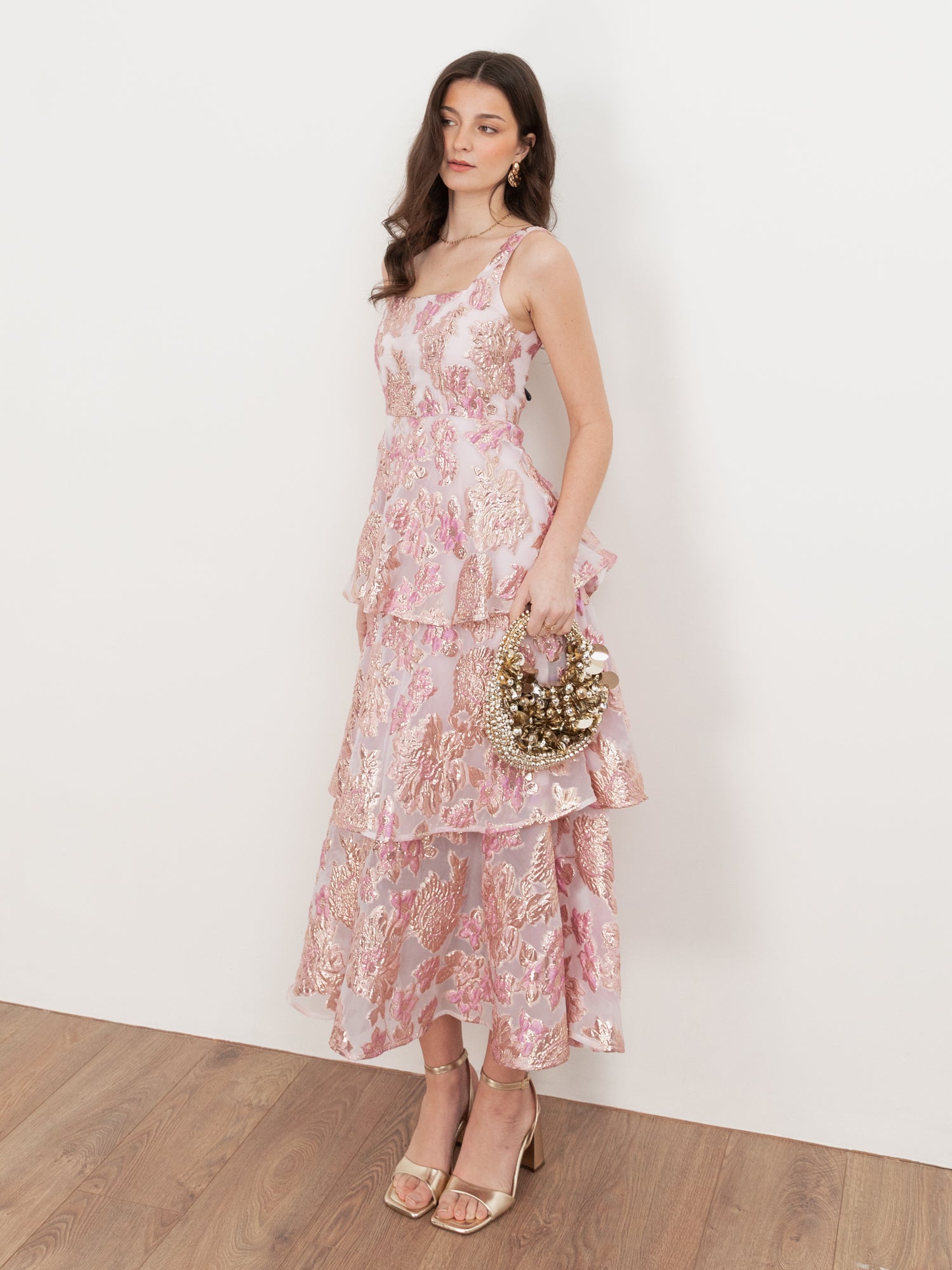 Subtle detailing lends depth and definition, striking a refined balance between statement design and effortless sophistication. Framed by wide straps and a sculpted square neckline, the bodice embodies enduring elegance, while a vivid pink floral jacquard introduces a distinctly modern note. A tiered profile shapes the voluminous midi skirt, bringing structure and sculptural refinement to the silhouette. Complete the look with delicate jewellery and strappy heels for a polished finish.