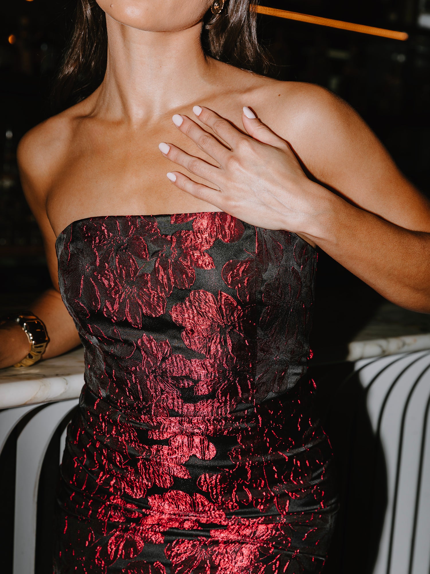 Defined by sophisticated refinement and contemporary allure, this midi dress is tailored to a sleek bodycon silhouette that flatters the form with effortless ease. Crafted from a black base adorned with a red floral jacquard, the fabric is enhanced by raised detailing that adds depth and texture, resulting in a design as tactile as it is striking. The bandeau neckline features discreet anti-slip tape for a secure and comfortable fit, while a subtle back split on the midi skirt ensures graceful movement. At the reverse, the piece de resistance takes form in a dramatic self-tie bow that cinches the waist before cascading into elongated tails that trace the curves with fluidity. Complete the look with delicate heels and statement drop earrings for an ensemble that captivates.