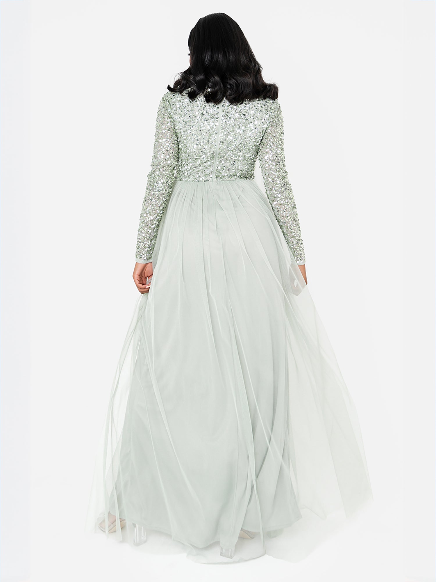 Feel elegant in this long sleeve maxi dress from Maya Deluxe perfect for autumn events. In our popular Green Lily shade matching hand sewn sequin embellishment is drenched over the fitted bodice and long sleeves that are layered with extra tulle fabric for comfortable wear. Featuring a chic boat neckline and a floor sweeping soft tulle skirt that flairs from the waist giving the dress a romantic finish This gown is one of our most popular styles for bridesmaids.