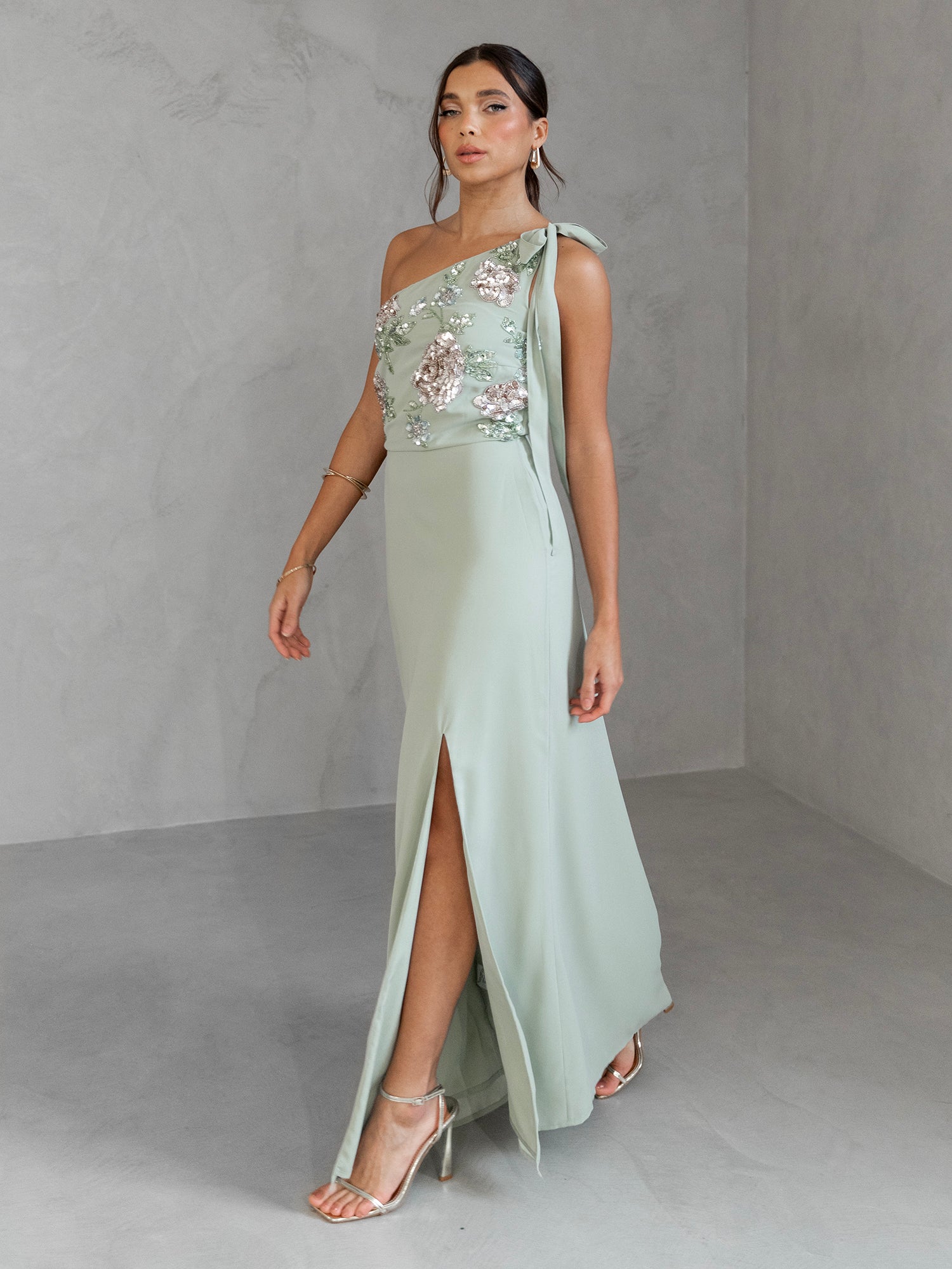 Designed to captivate attention and elevate any occasion, this maxi exudes modern elegance. Just look to the bodice - a true work of art with its one shoulder neckline perfectly tied into a bow to suit any figure, and intricate floral embellishment to the front catches the light with every step. Crafted from lightweight Georgette fabric, the maxi skirt flows effortlessly into an A-line silhouette, enhanced by an alluring skirt split for ease of movement. Pick a shade from the embellishment to further accessories this Sage Green maxi dress.
