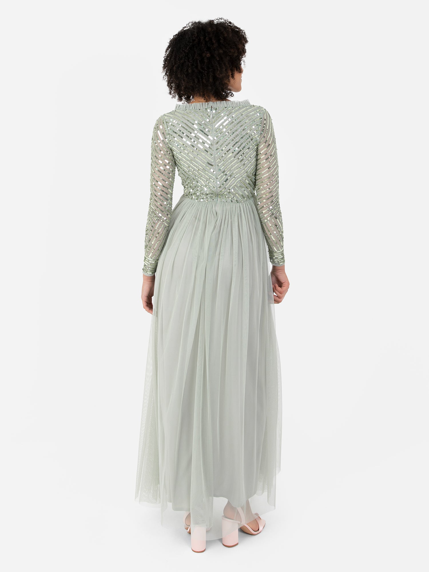 Crafted with precision and attention to detail this dress is made for formal events black tie weddings and other special occasions. Shimmering bodice offers a flattering yet modern look with its precisely placed stripe embellishment that follows the faux wrap bodice and long sleeve lines. Feminine frill detail on the neckline brings a soft romantic aesthetic to the dress. Flattering silhouette is accomplished by a cinched waist and gently ruffled hem that gracefully skims the parquet. Style this maxi gown with Silver strappy heels and a sleek low bun.