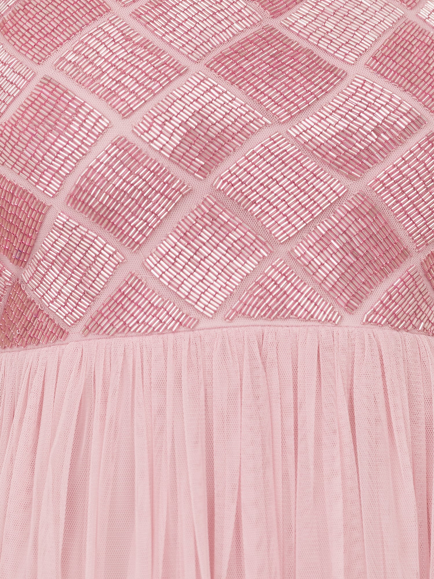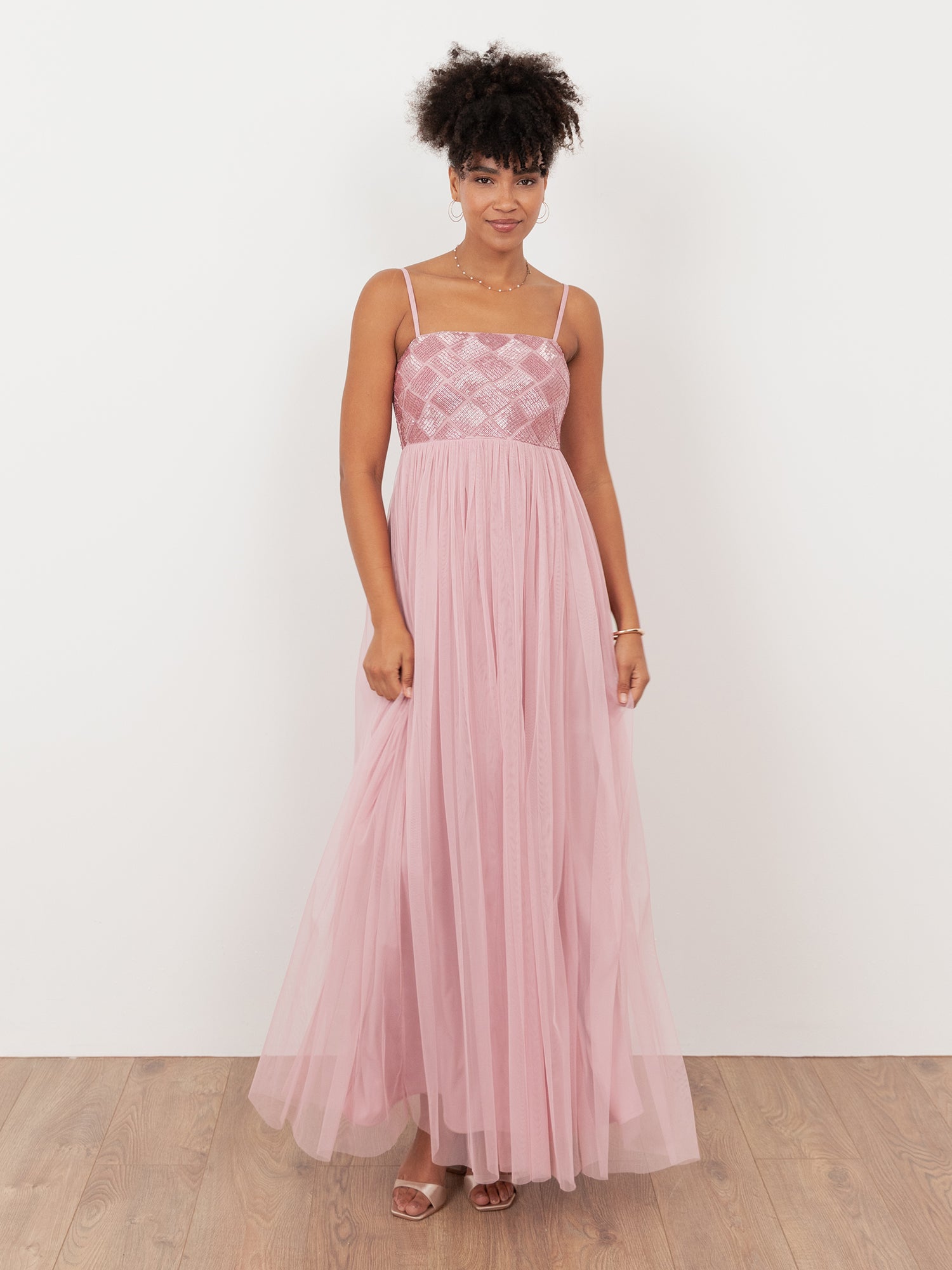 From aisle to dance floor, this strappy maxi ensures bridesmaids shine with timeless elegance. The fully embellished bodice features precisely placed beads arranged at alternating angles, forming a mesmerizing geometric pattern. It also boasts a square neckline, slender adjustable straps, and an empire waist, embodying a trendy, glamorous style. The tulle maxi skirt allows you to move and dance freely, with an A-line silhouette that flatters all body shapes. Complete the look with shimmering accessories and a chic clutch bag.