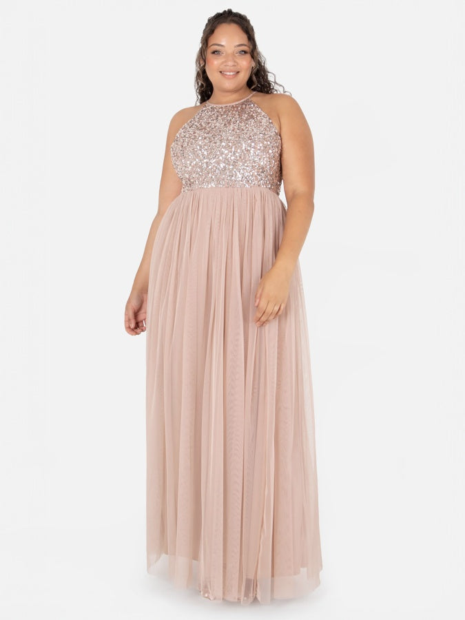 Maya Taupe Blush Embellished Halter Neck Maxi Dress