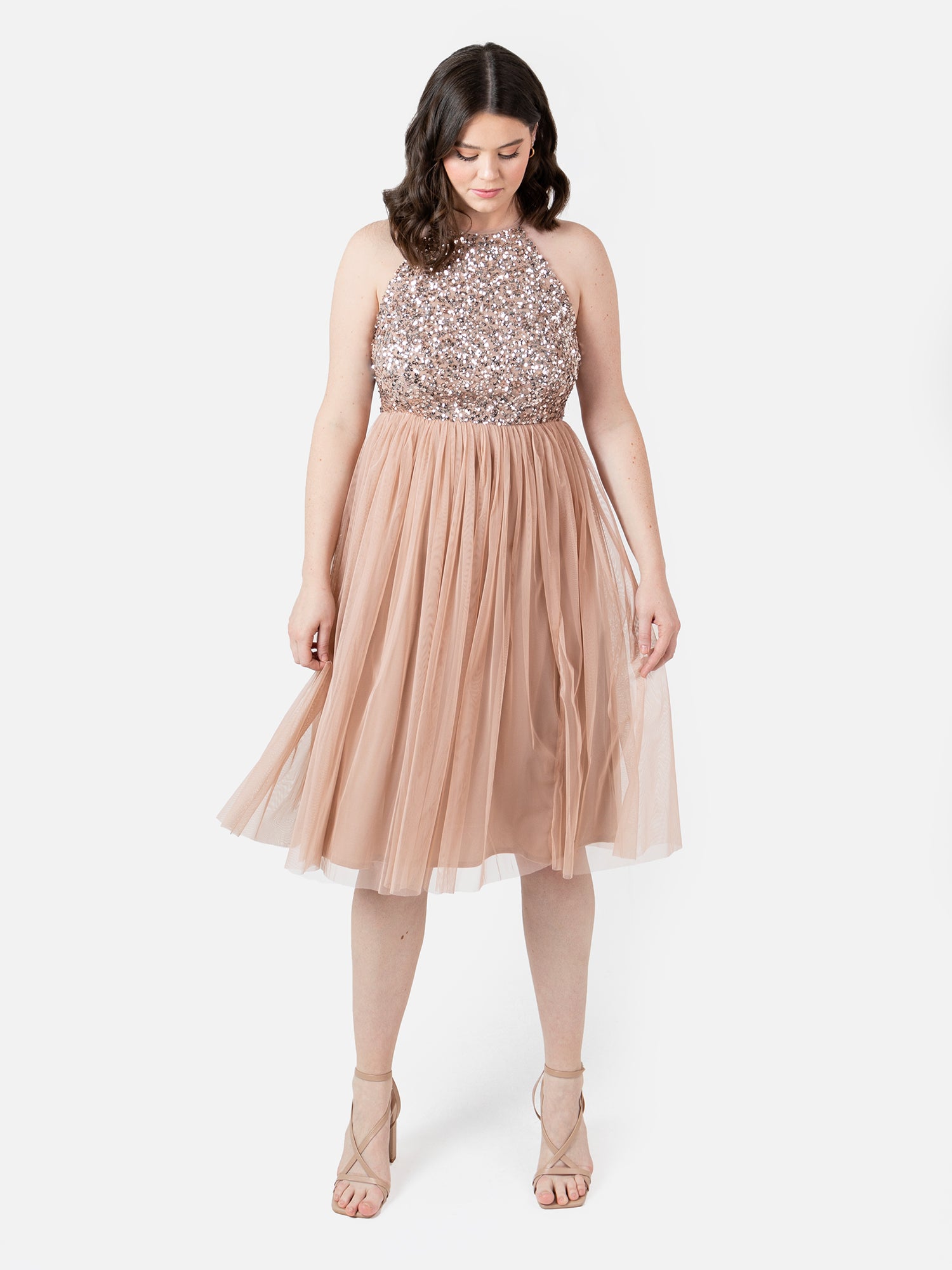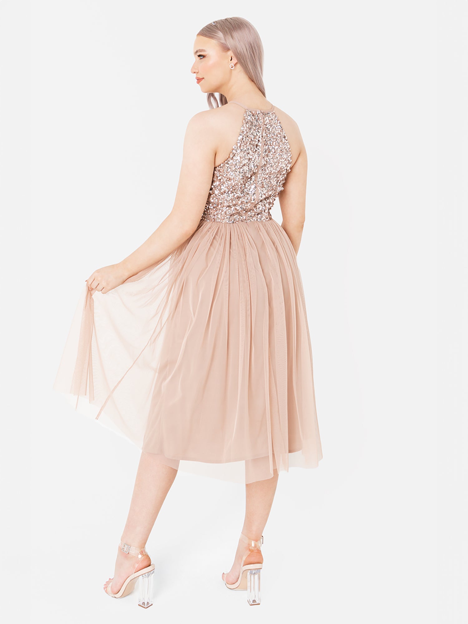Maya Taupe Blush Embellished Halter Neck Midi Dress