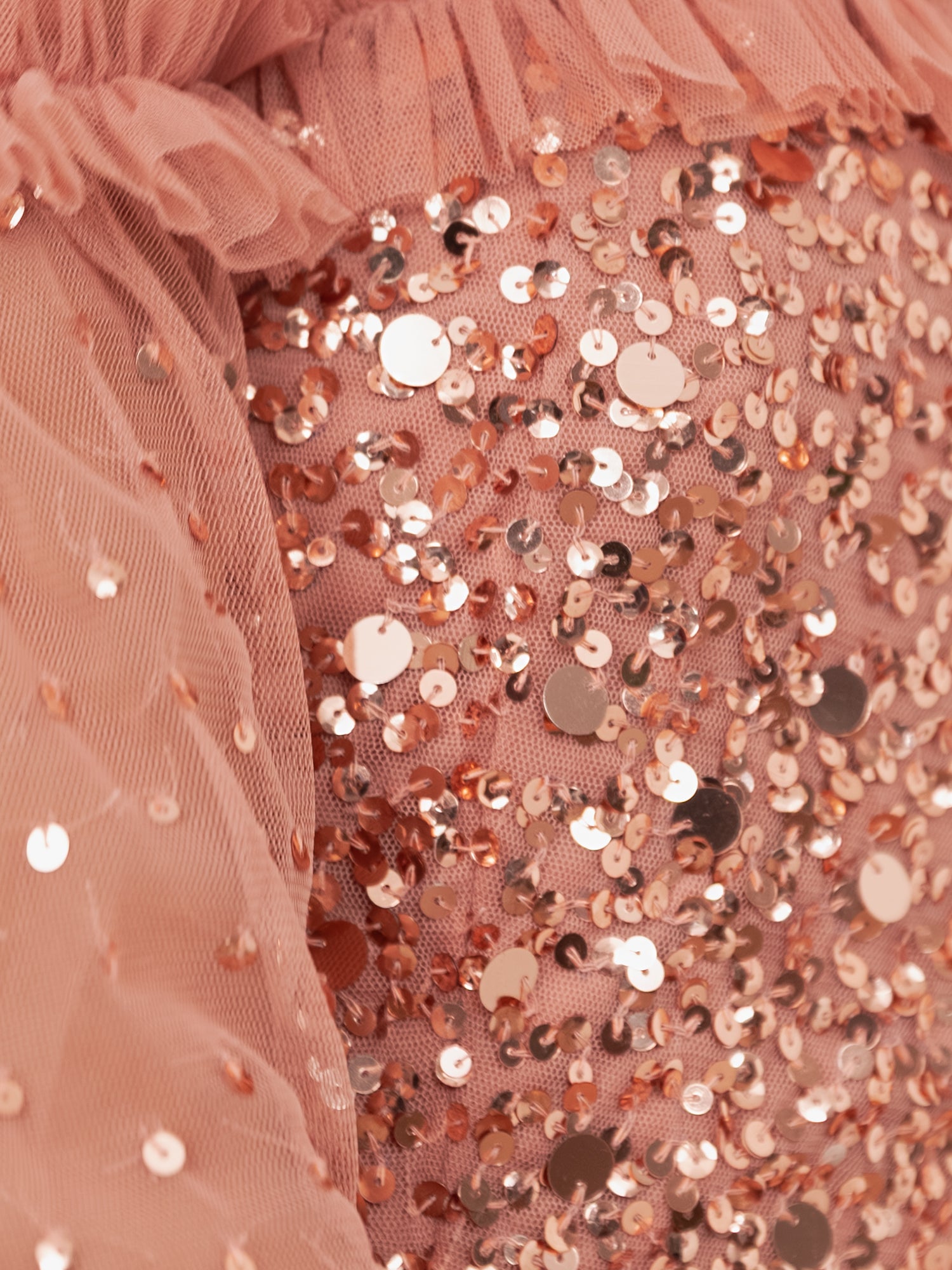 An enchanting choice for evening soirees and distinguished celebrations, this Terracotta Pink dress epitomises romantic sophistication. The Bardot neckline is adorned with delicate tulle frills, while fluttering short sleeves lend a soft, feminine grace. The form-fitting bodice shimmers with an artful scattering of small and large sequins, flowing seamlessly onto the voluminous skirt. Cinched elegantly at the waist, the skirt forms a graceful A-line silhouette, falling to an ankle-grazing hem. Complete the ensemble with gold heels and understated jewellery for a look of effortless refinement.