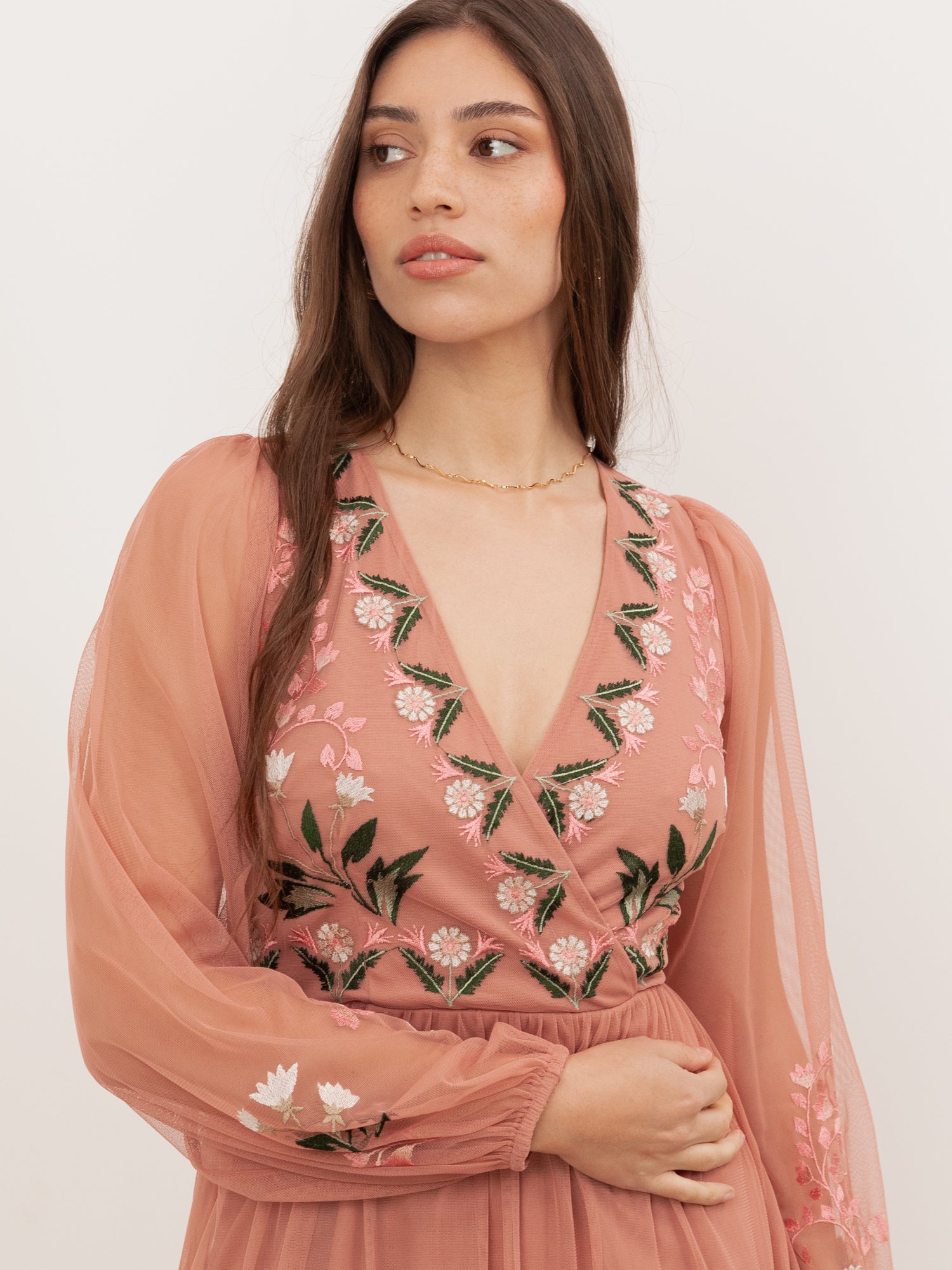 Maya Terracotta Pink Embroidered Faux Wrap Maxi Sleeve Midaxi Dress