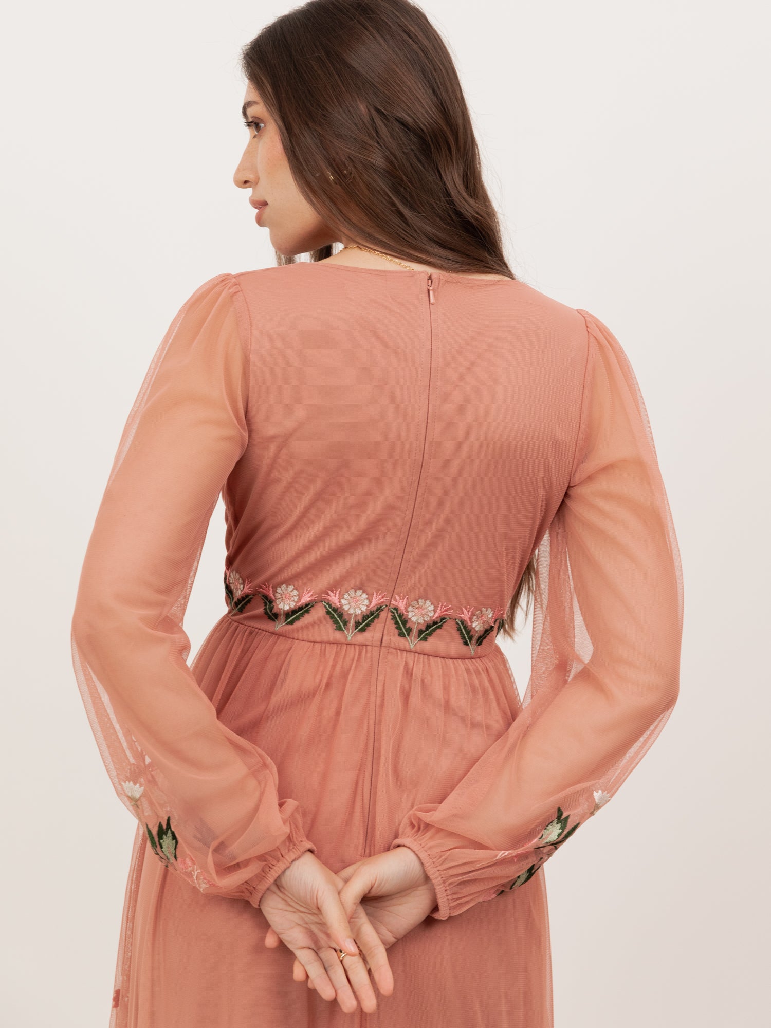 For an unforgettable entrance, this muted pink floral gown offers a masterclass in modern elegance. Exquisitely crafted from whisper-soft tulle, it is adorned with intricately hand-sewn floral embroidery that cascades across the bodice and ankle-skimming skirt. The sheer long sleeves introduce a contemporary allure, while the faux-wrap bodice lends a beautifully feminine finish. Falling to a flattering midaxi length, the A-line silhouette is softly structured with delicate ruffles from the gathered waist and a subtle hem panel, creating flowing movement with every step. Complete your ensemble by selecting shoes and accessories that echo the delicate hues of the embroidered blooms for a polished, harmonious look.