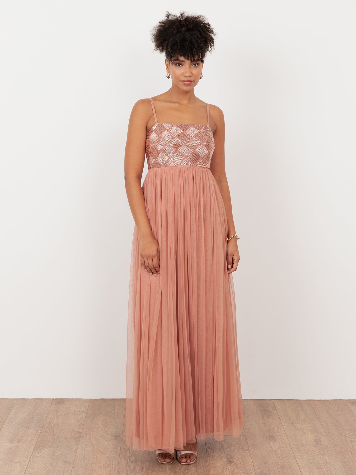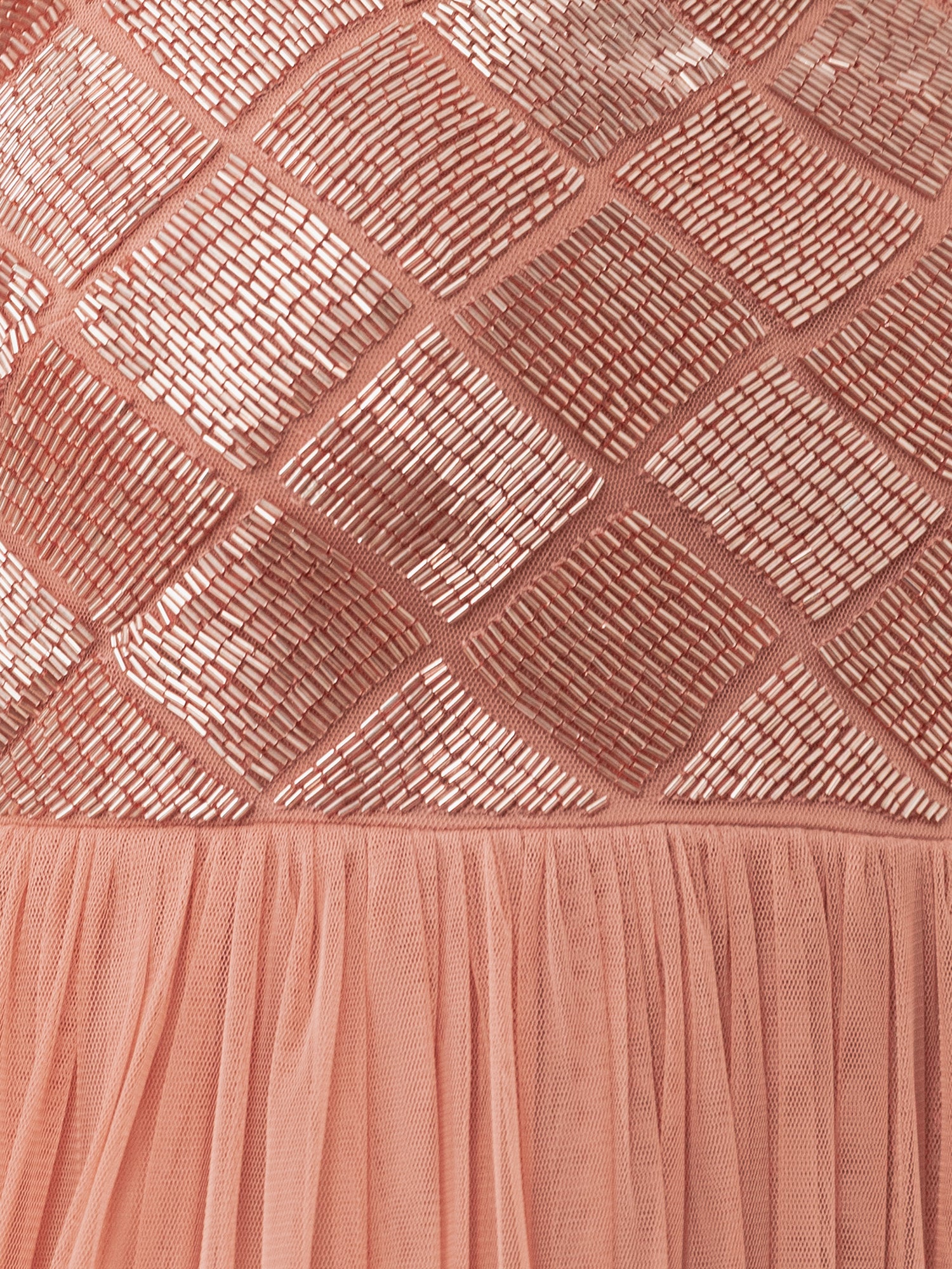From aisle to dance floor, this strappy maxi ensures bridesmaids shine with timeless elegance. The fully embellished bodice features precisely placed beads arranged at alternating angles, forming a mesmerizing geometric pattern. It also boasts a square neckline, slender adjustable straps, and an empire waist, embodying a trendy, glamorous style. The tulle maxi skirt allows you to move and dance freely, with an A-line silhouette that flatters all body shapes. Complete the look with shimmering accessories and a chic clutch bag.
