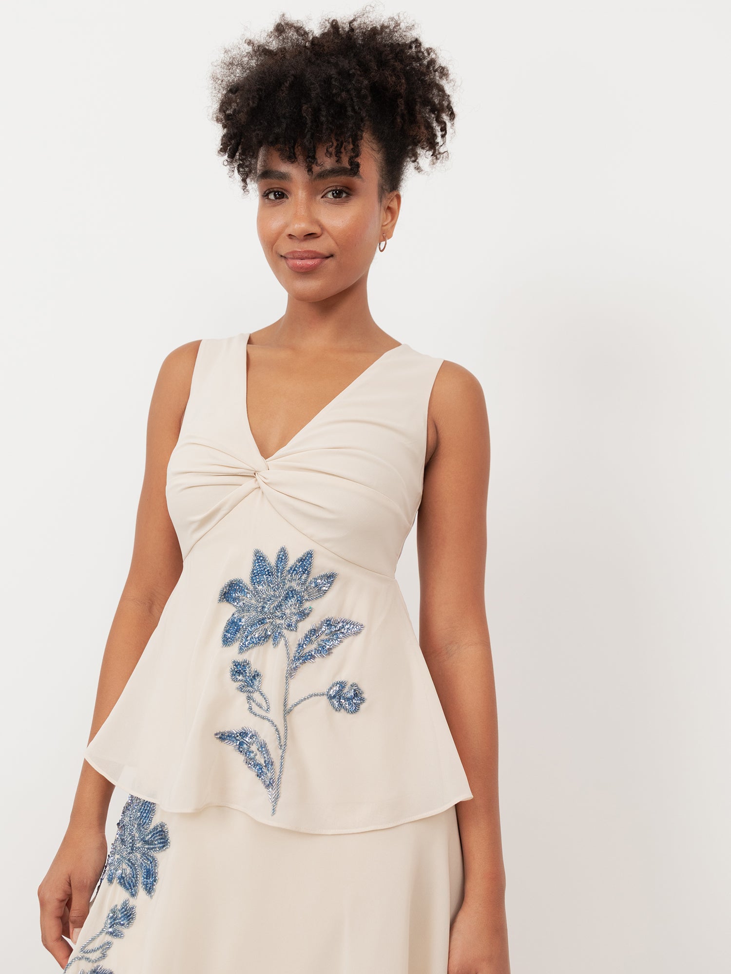Crafted from airy vanilla georgette, this dress exudes effortless elegance. The sleeveless bodice features a flattering V-neckline with a chic twist detail at the base, adding a subtle touch of sophistication. The tiered midaxi skirt is adorned with delicate blue floral motifs, hand-sewn with shimmering sequins and beads for a hint of sparkle. A side split adds a playful, modern edge, making this dress perfect for both day and evening occasions. Pair with strappy heels and minimal accessories to let the intricate detailing shine.