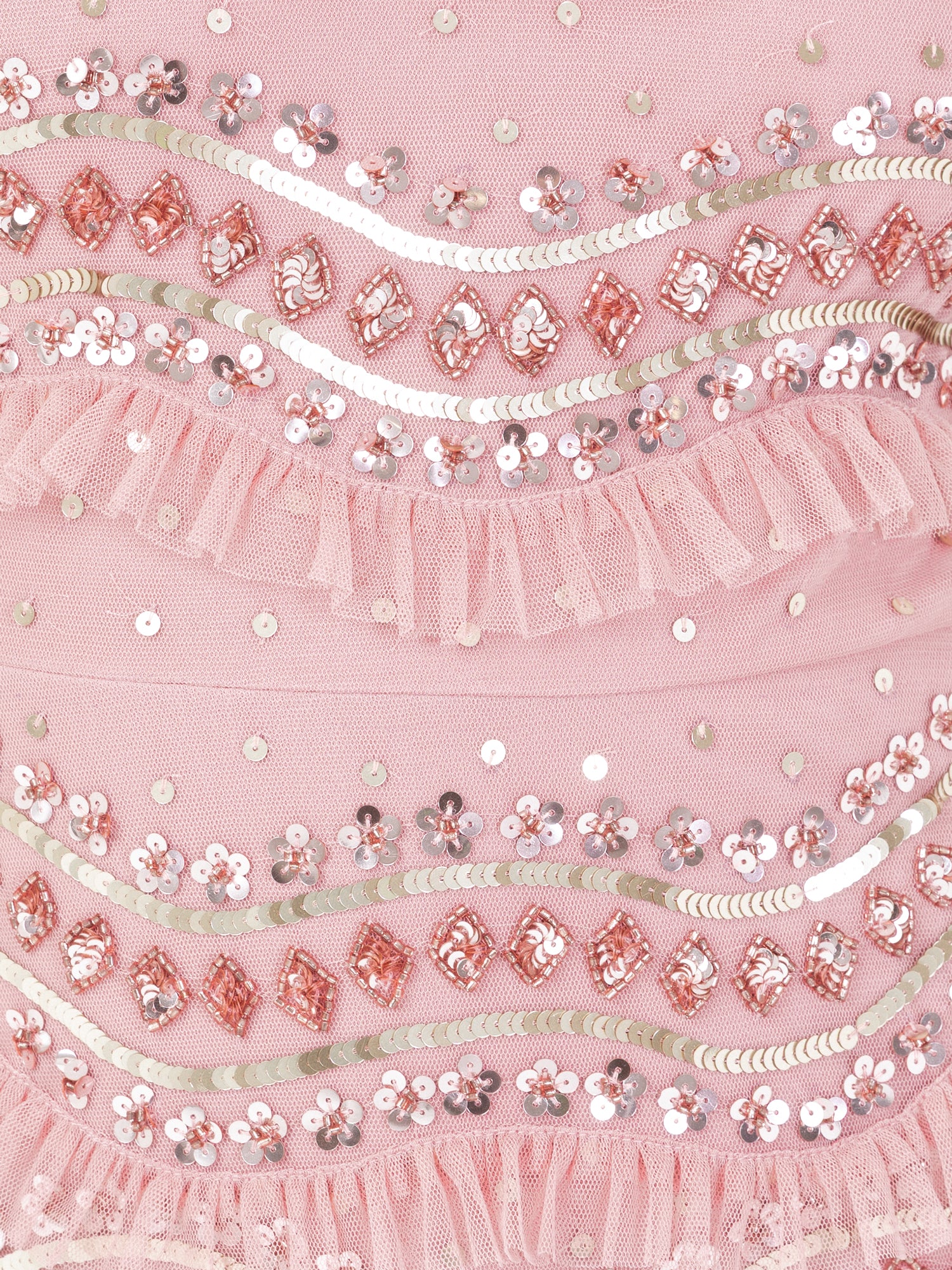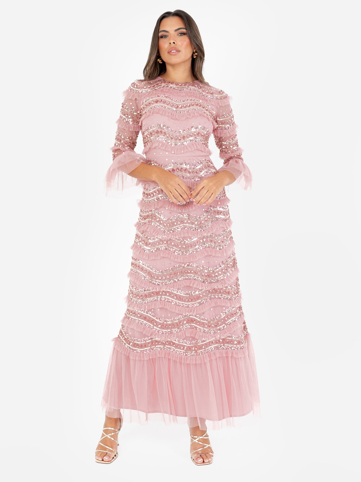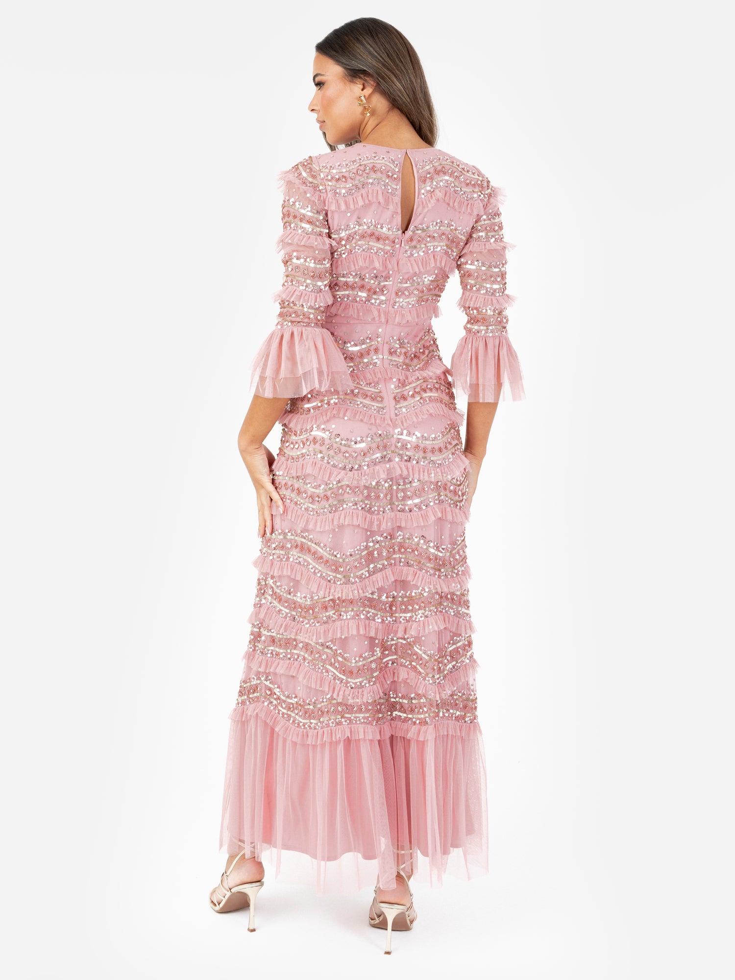 A masterclass in embellishment and elegant design, this premium maxi dress offers a refined take on occasionwear. Framed by a round neckline and bell sleeves, the fitted bodice finished with a discreet keyhole detail to the reverse flows into an A-line maxi skirt, creating a timeless silhouette. Intricately embellished throughout, the dress features a scalloped design of alternating textures: five shimmering rows of gold and pink sequins and beads, followed by a layer of frilled tulle. It pairs beautifully with gold heels and drop earrings for a statement look at gala evenings, formal celebrations, or red-carpet events.