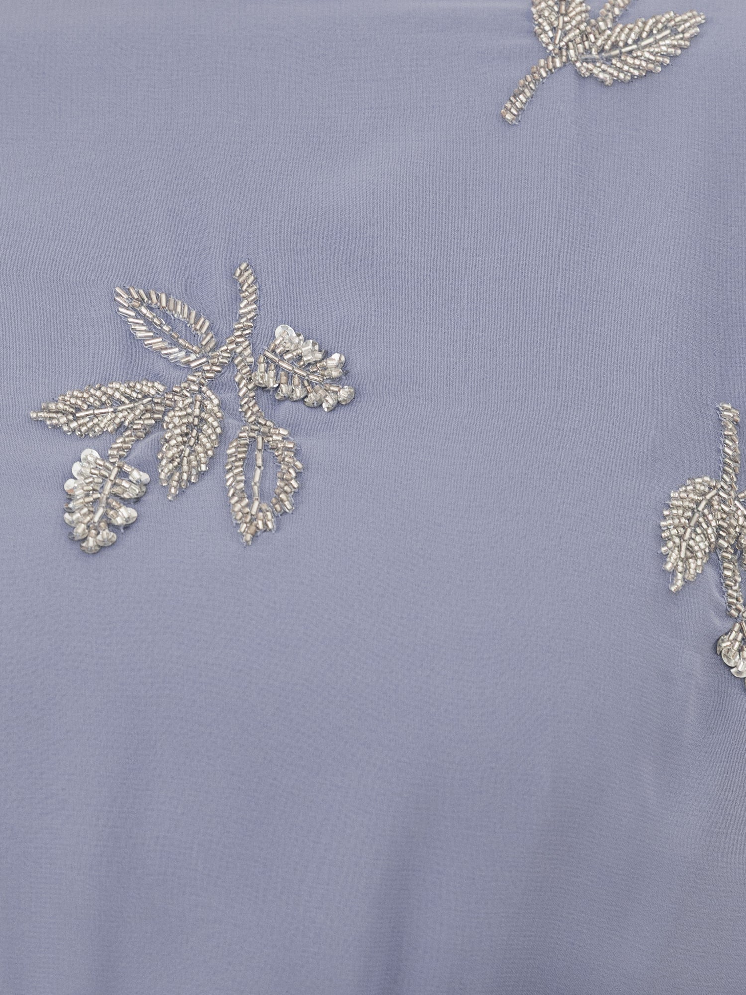 Designed for moments where timeless elegance meets modern refinement, this piece is crafted from Wisteria Blue georgette and accented with delicate, hand-sewn floral appliques. A modest round neckline is framed by voluminous cape sleeves, creating a dramatic yet refined silhouette. The bodice drapes softly at the waist before flowing into an A-line skirt with a side split, lending fluidity and a flattering finish. Complete the look with gold heels and fine jewellery for a polished occasion ensemble.