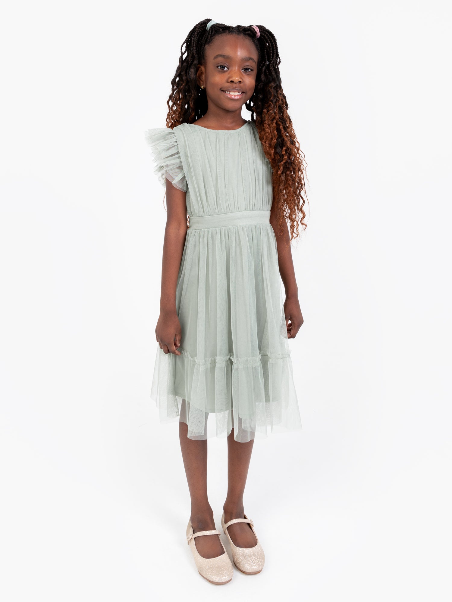 Mini Anaya Recycled Frosty Green Flutter Sleeve Midi Dress with Bow Detail