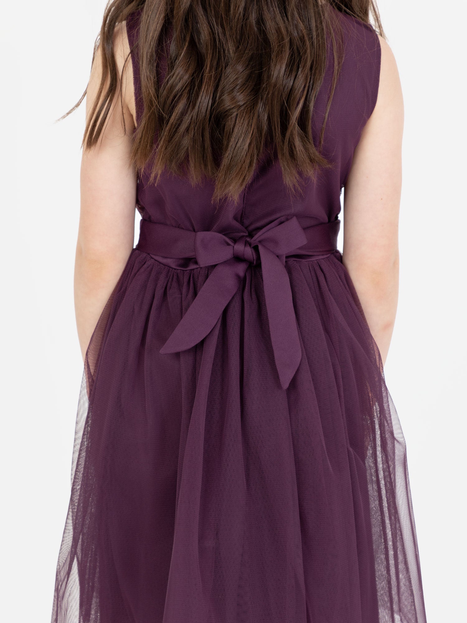 An ideal choice for your flower girls this Mini Maya dress promises a day of endless twirls. Featuring a round neckline on a sleeveless bodice adorned with shimmering sequin and overlaid with soft tulle fabric to protect their delicate skin. Satin waistband ties in a beautiful bow to the back adding a charming note. Team this midi length dress with sparkling shoes and headband for that magically spellbinding fairy-tale look.