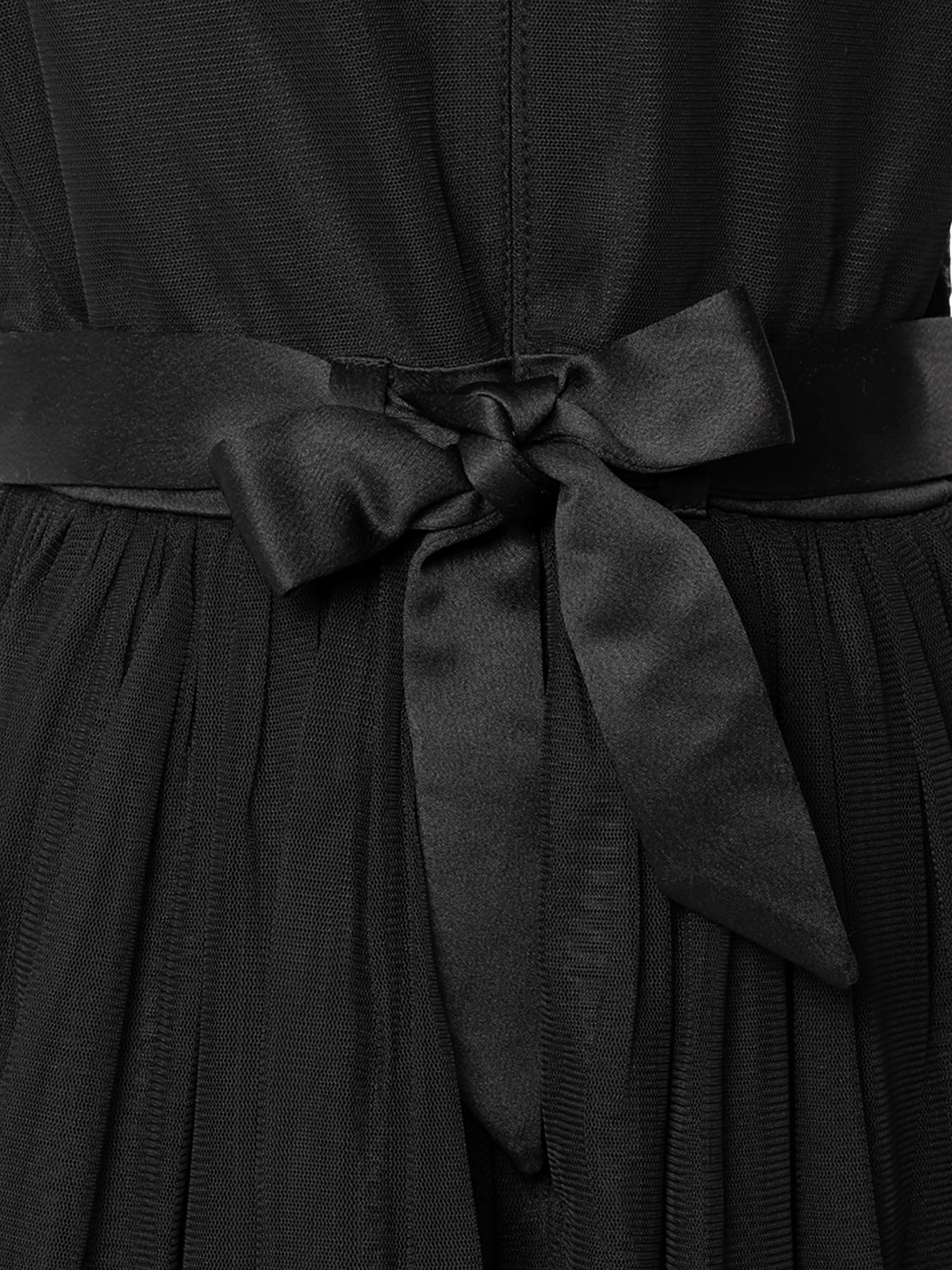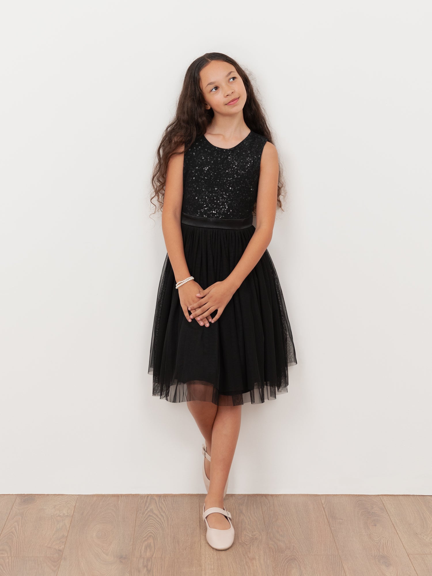 An ideal choice for your flower girls this Black Mini Maya dress promises a day of endless twirls. Featuring a round neckline on a sleeveless bodice adorned with shimmering sequin and overlaid with soft tulle fabric to protect their delicate skin. Satin waistband ties in a beautiful bow to the back adding a charming note. Team this midi length dress with sparkling shoes and headband for that magically spellbinding fairy-tale look.