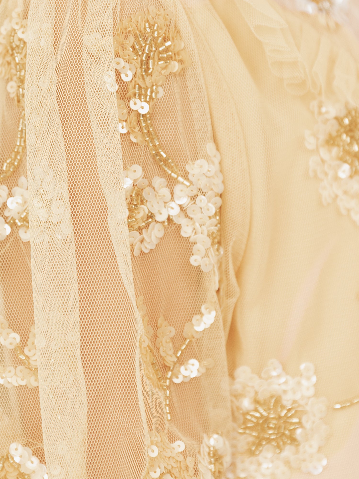 Designed for little ones with a love of sparkle and style, this midi dress mirrors the elegance of the matching grown-up gown. Adorned with hand-embellished sequins and beads forming delicate floral motifs, it captures a sense of youthful grace. The fitted bodice features a round neckline with a sheer V-shaped yoke and soft tulle ruffles, complemented by fluttering angel sleeves. A gently flared midi skirt falls with light movement, finished with frilled trims and scattered embellishments for a touch of magic. Perfect for special occasions, pair it with ballet flats and a sweet hair accessory for an enchanting look.