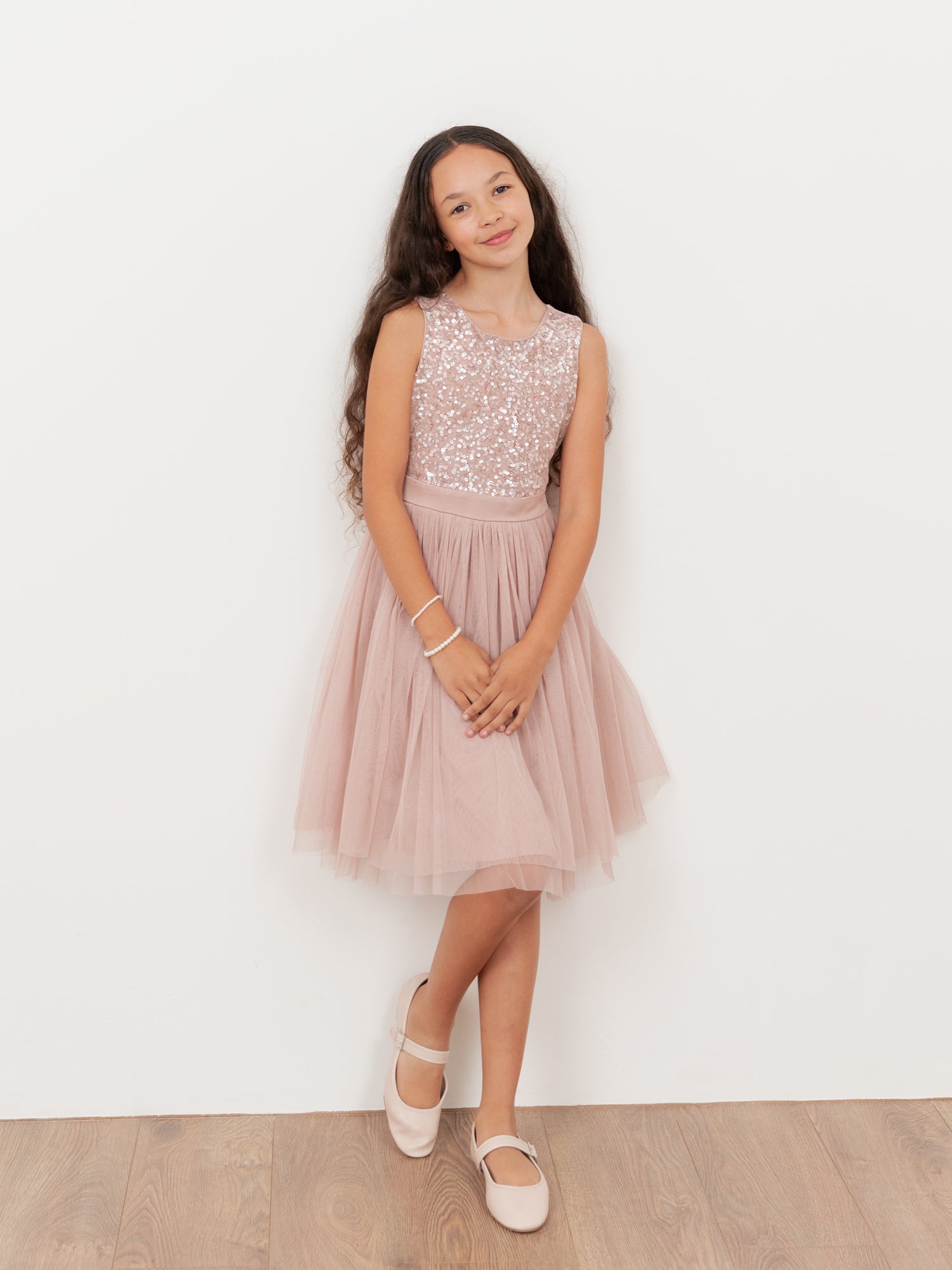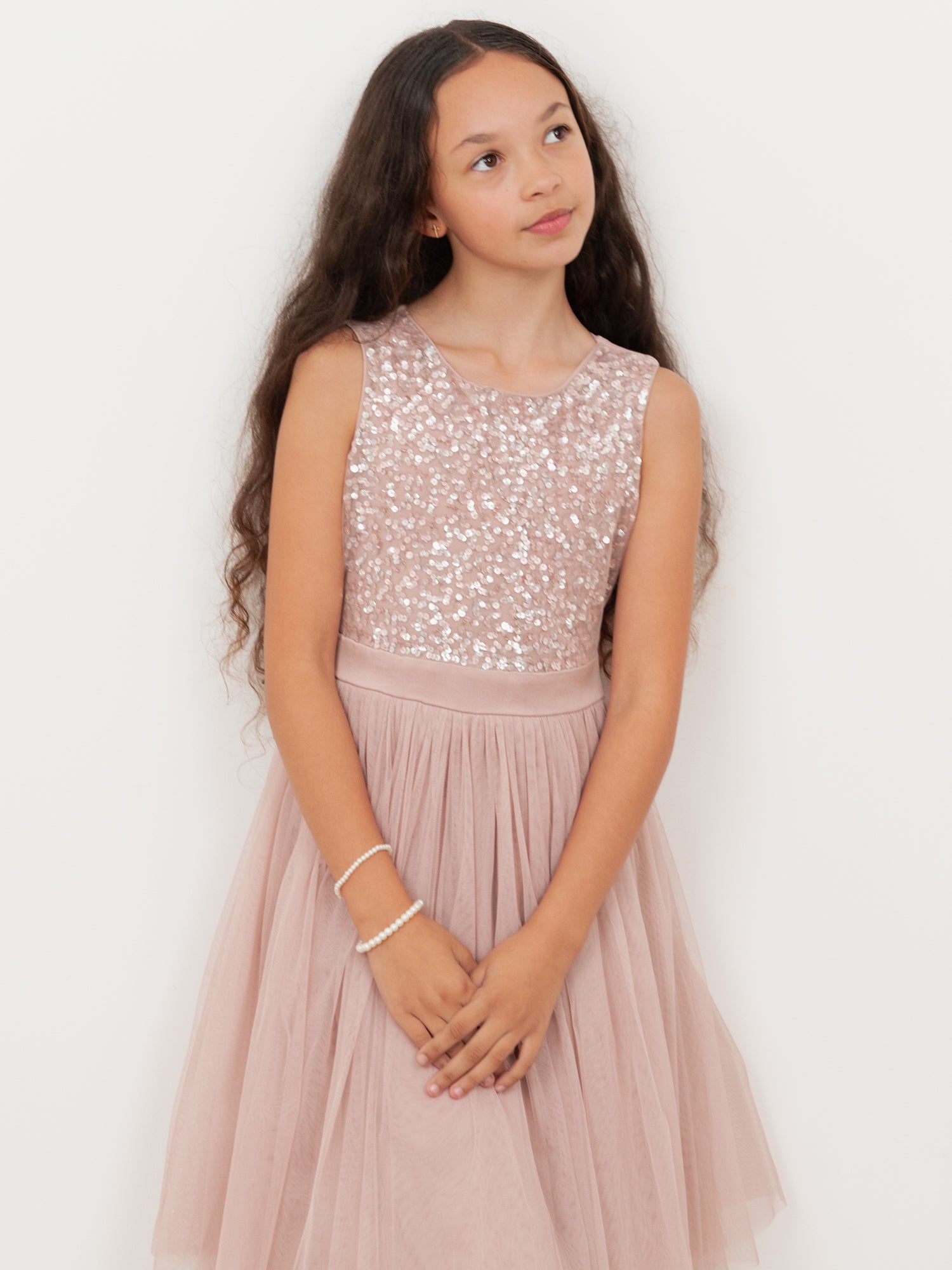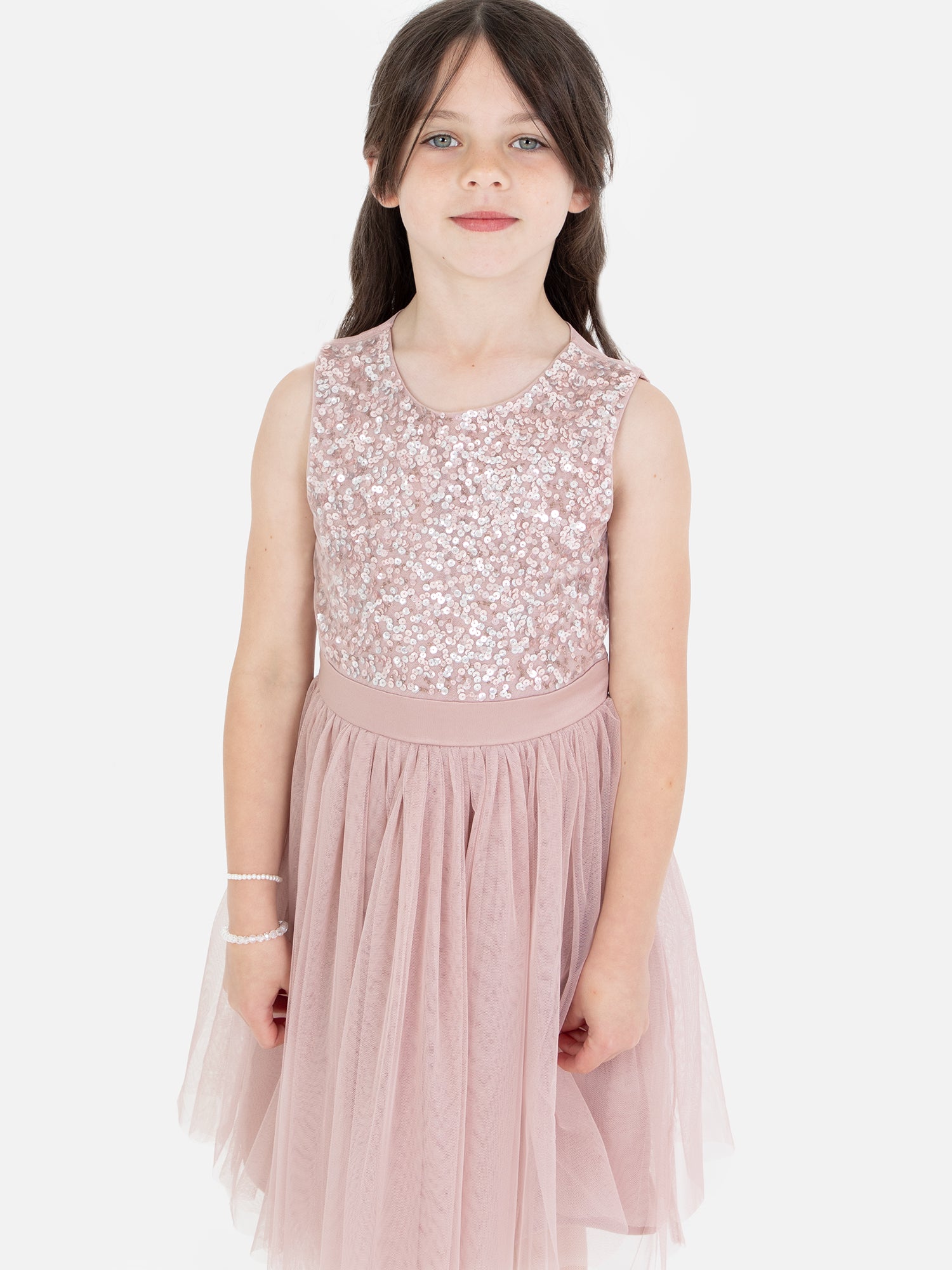An ideal choice for your flower girls this Mini Maya dress promises a day of endless twirls. Featuring a round neckline on a sleeveless bodice adorned with shimmering sequin and overlaid with soft tulle fabric to protect their delicate skin. Satin waistband ties in a beautiful bow to the back adding a charming note. Team this midi length dress with sparkling shoes and headband for that magically spellbinding fairy-tale look.